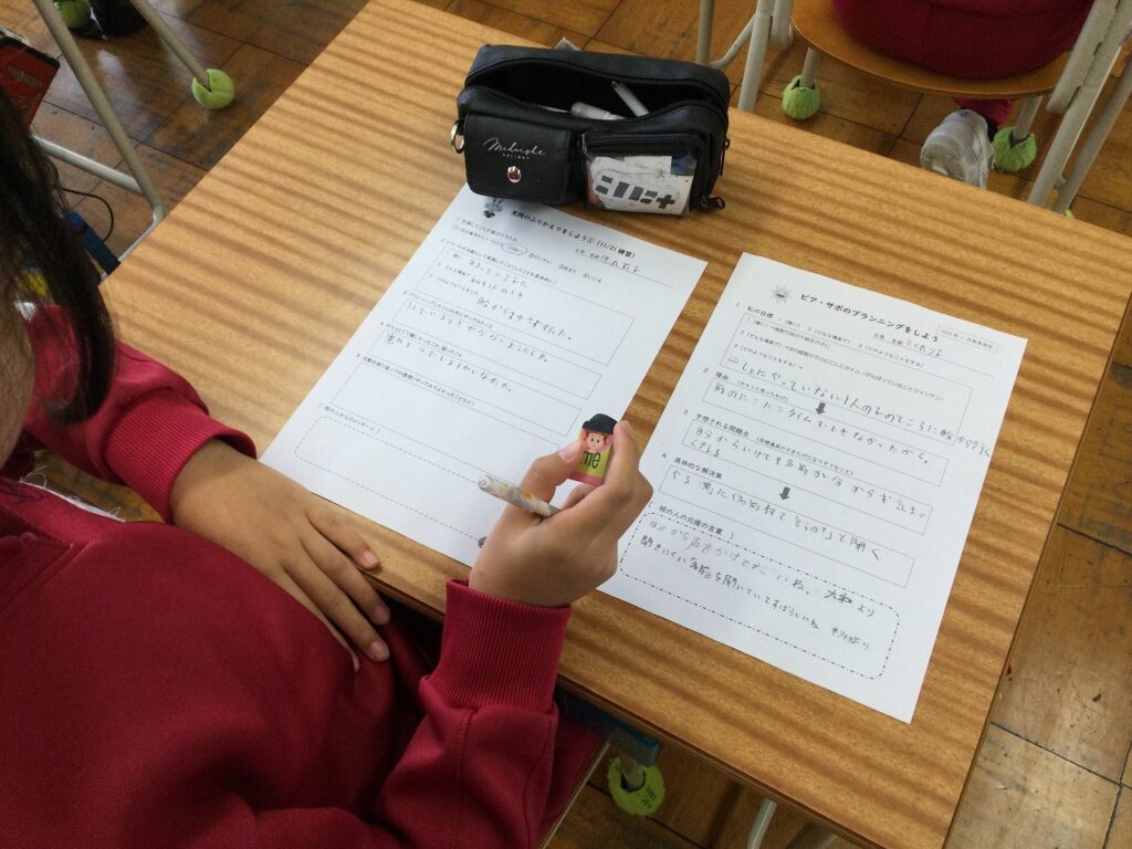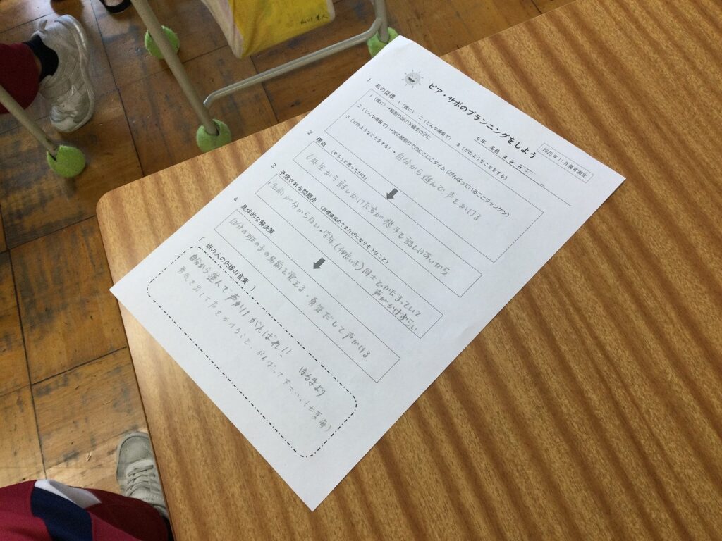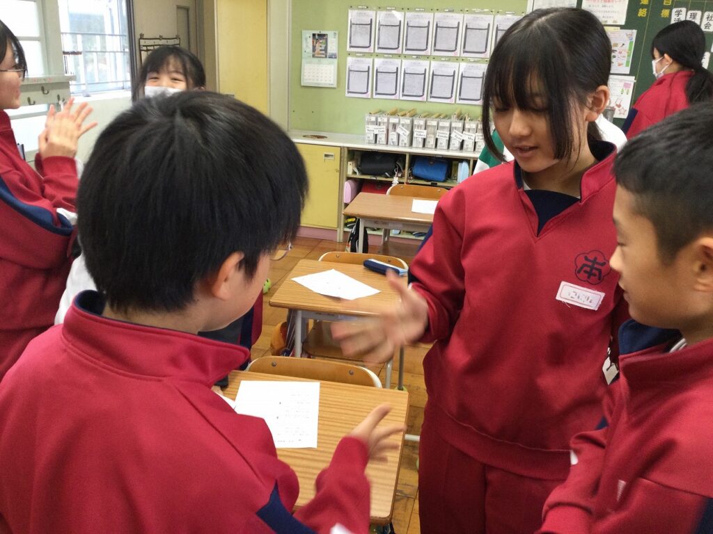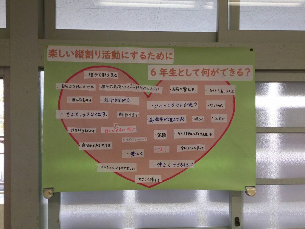 そして、6年生は今朝のにこにこタイムで、楽しい縦割り活動にするためにプランニングした内容を、自分たちで実践してみました。「自分から声をかける」「やさしい声で誘う」「一人でいる子のところへ自分から行く」など、自分の考えたことを6年生同士でやってみました。