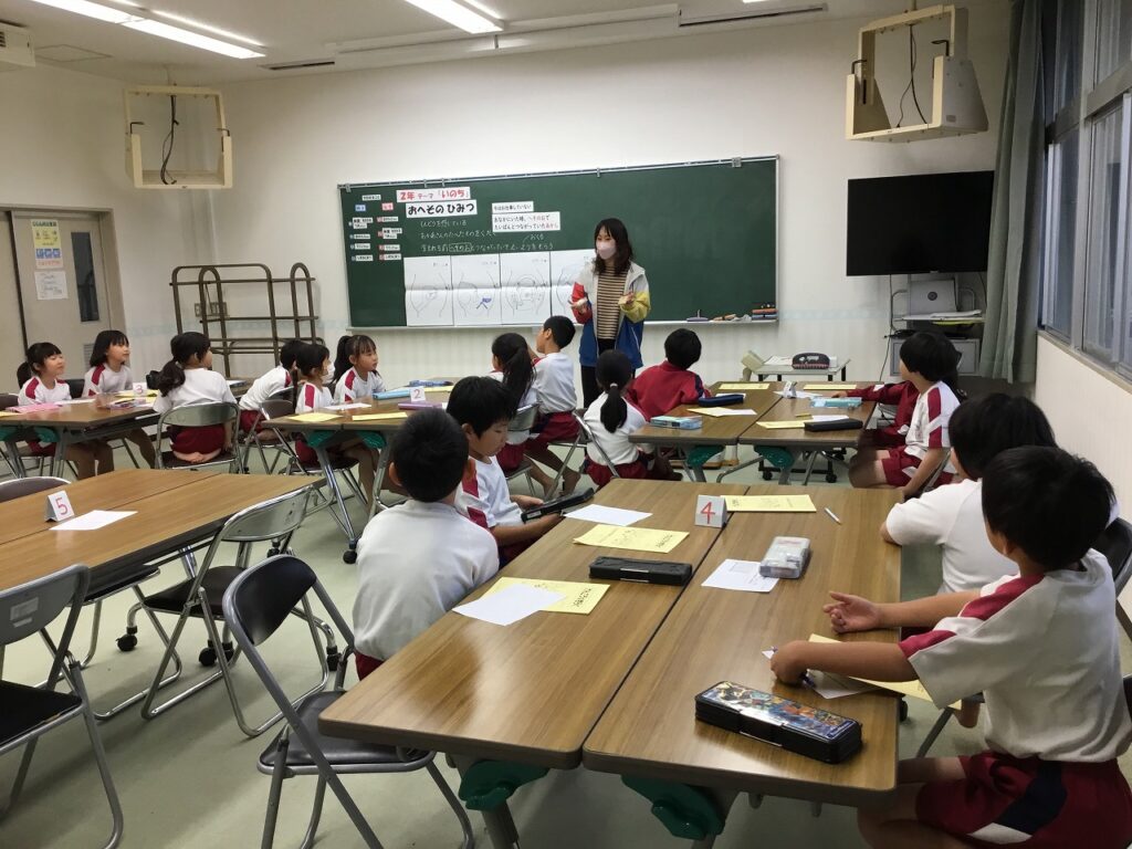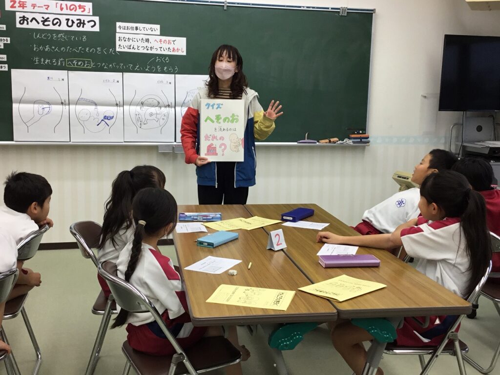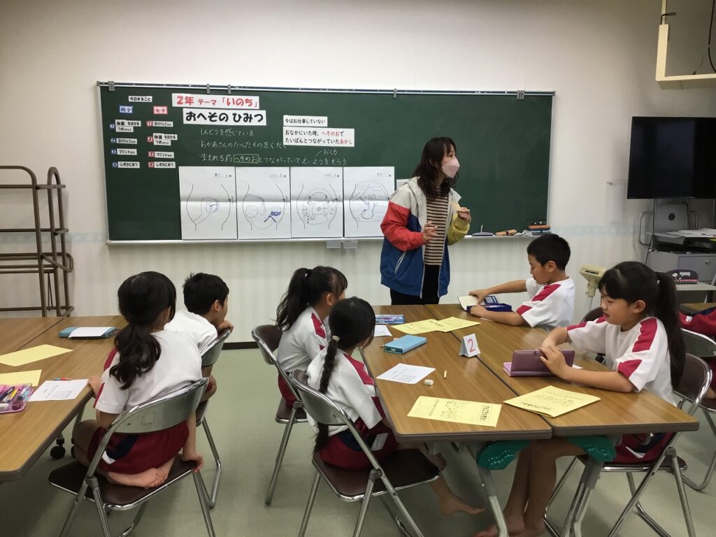 今週一週間をかけて、すべての学年で体重と視力測定が行われ、学年に合った保健指導も行われました。2年生のテーマは「いのち」。おへそのひみつや、へその緒について学んでいました。