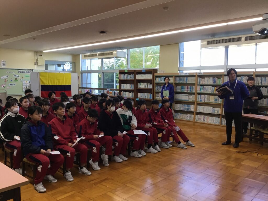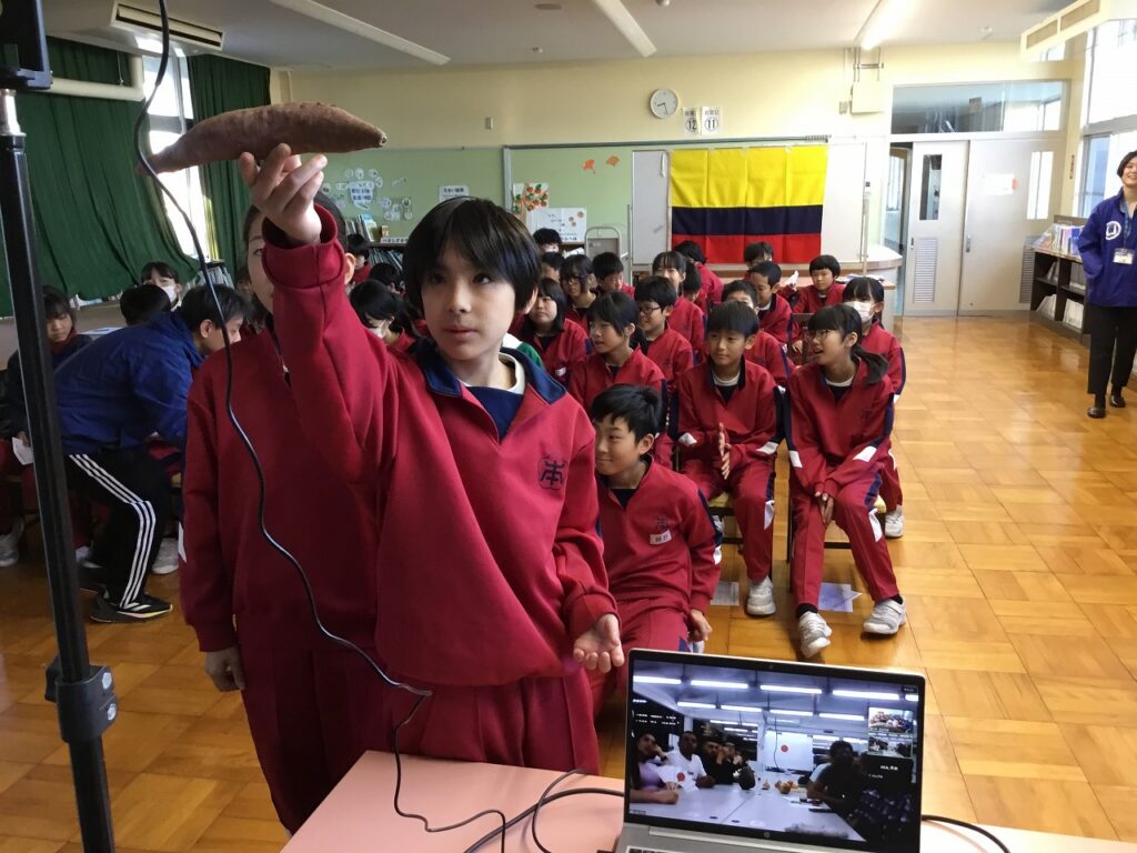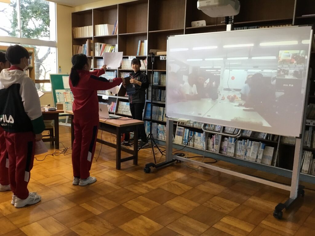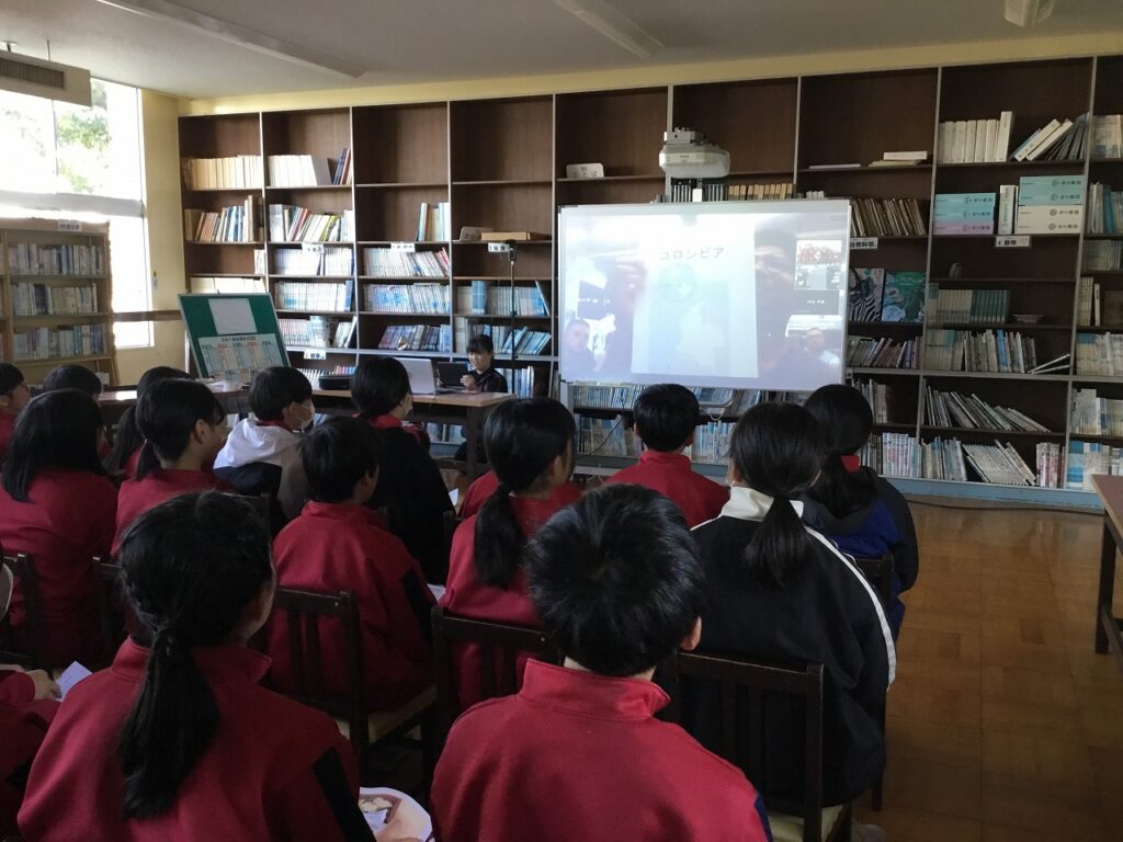 はじめに本校の児童が学校や学校行事、あわら市について紹介しました。次に、コロンビアの学生さんたちがコロンビアの果物や大好きな日本食などについて紹介してくださいました。