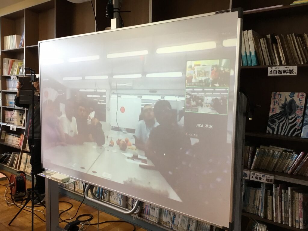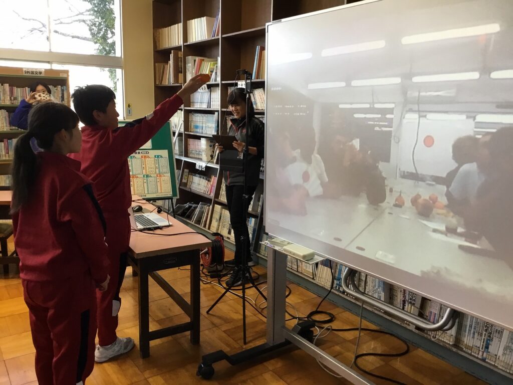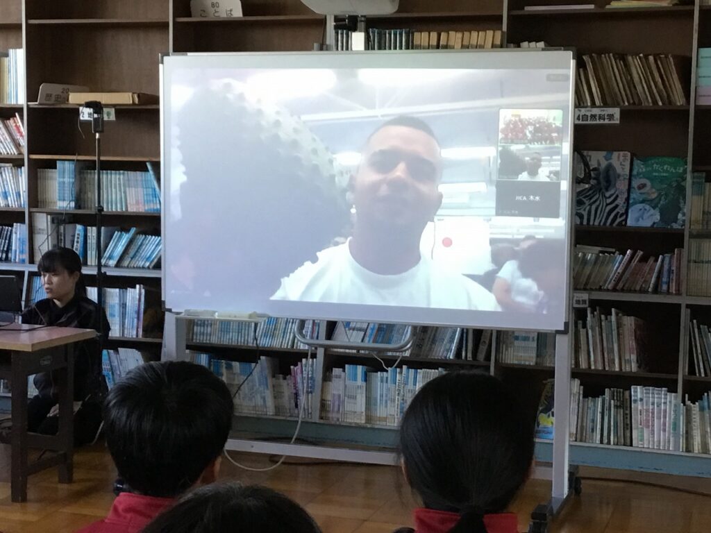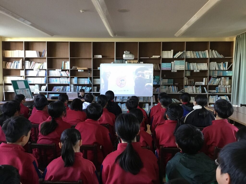 はじめに本校の児童が学校や学校行事、あわら市について紹介しました。次に、コロンビアの学生さんたちがコロンビアの果物や大好きな日本食などについて紹介してくださいました。
