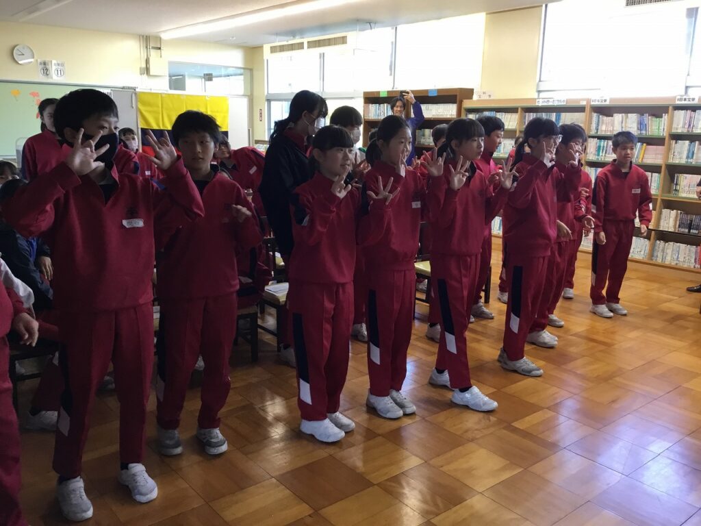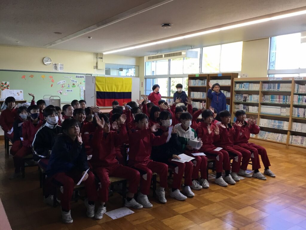 質問コーナーの中では、子どもたちが今、日本で流行っている歌とダンスを披露しました。最後は、スペイン語で感謝のことばとお別れのあいさつを伝え、交流会を終えました。限られた時間でしたが、コロンビアの学生さんたちと楽しく交流することができました。