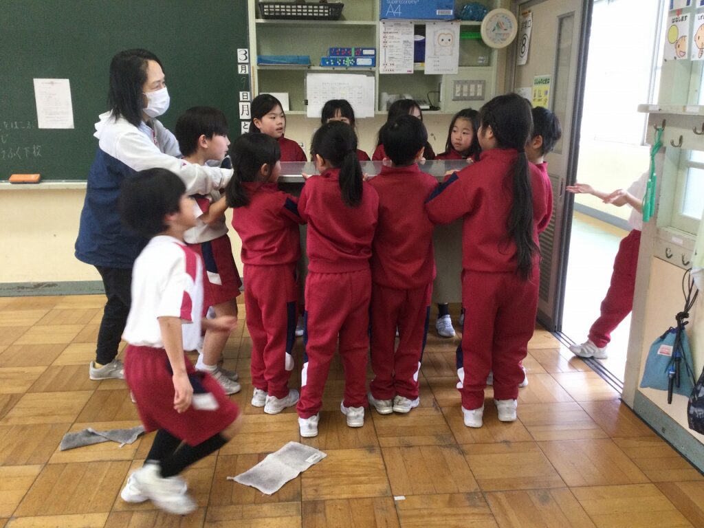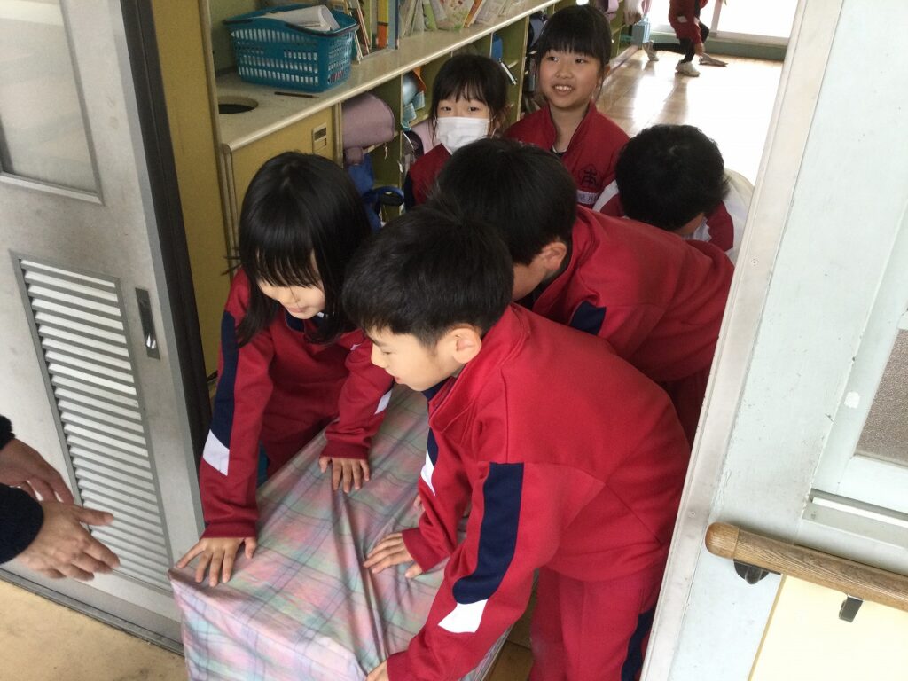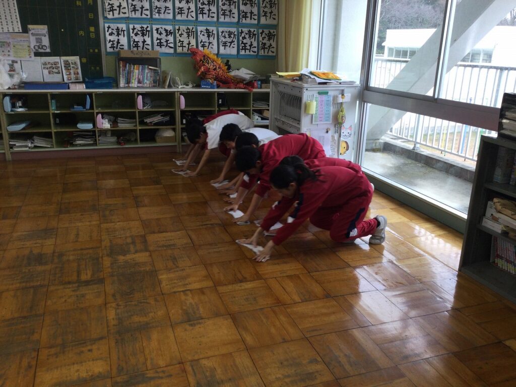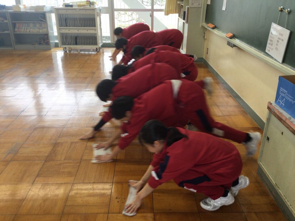 下校前に、教室の机やいすなどをすべて廊下に出しました。教室の床のワックスがけのためです。どのクラスも床のほこりをきれいに取り除きました。来年度、ピカピカの教室で気持ちよく過ごすことができそうです。