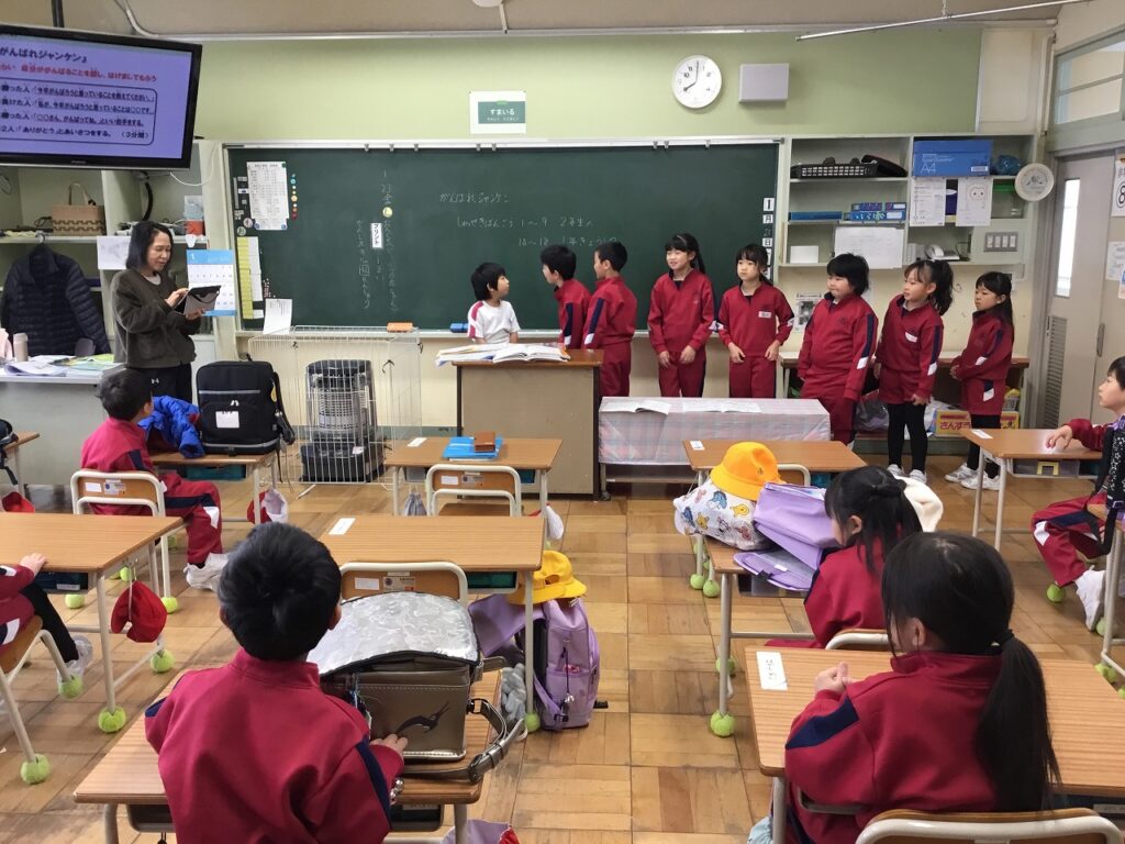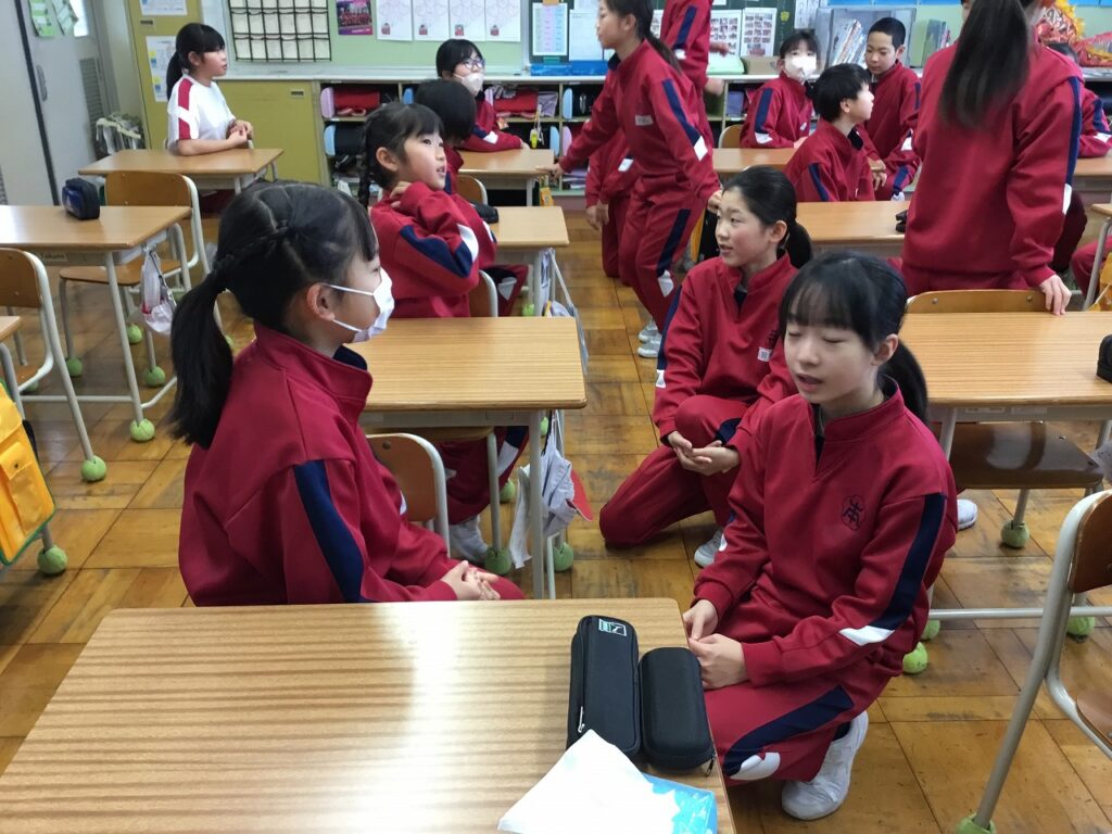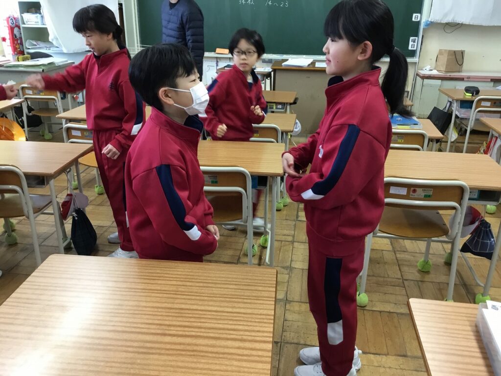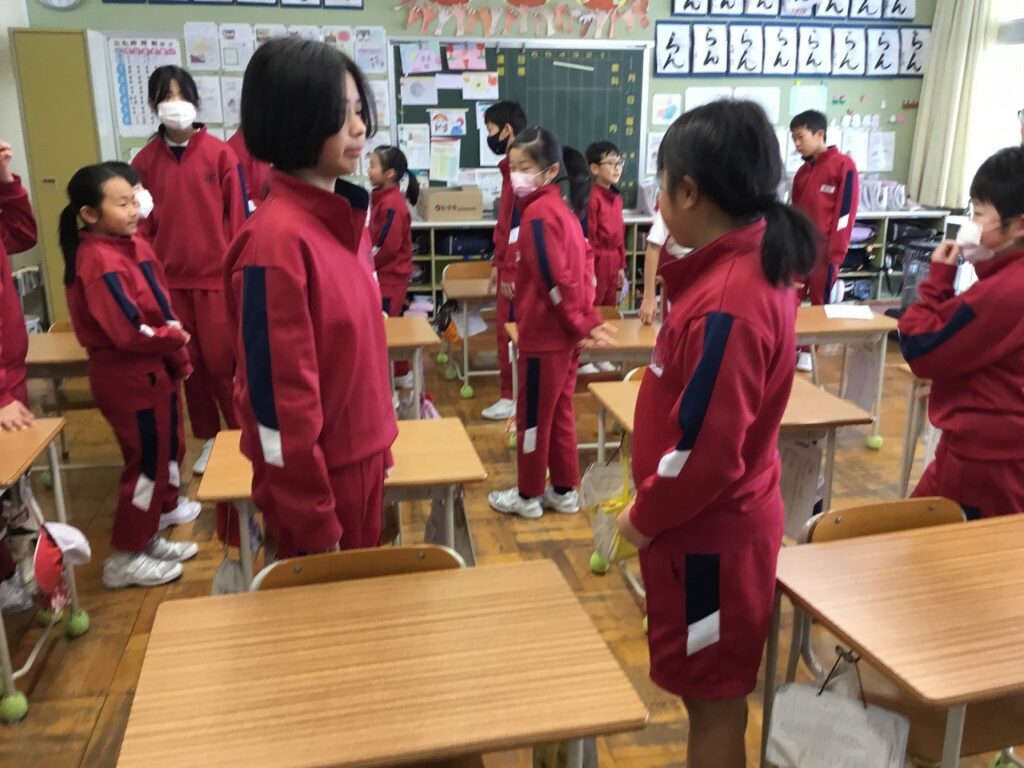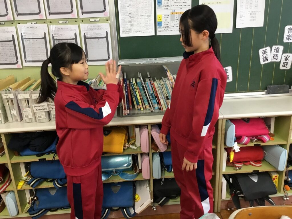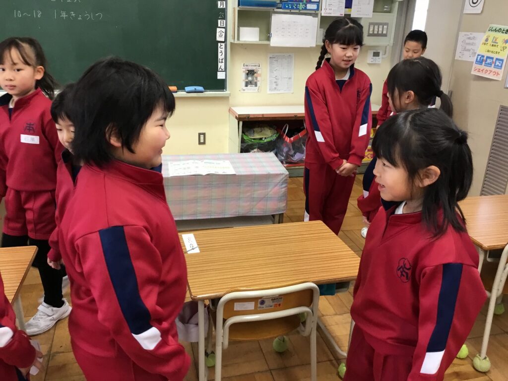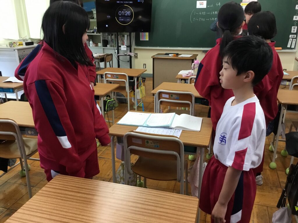朝活動は「にこにこタイム」でした。先週、各学級で行った『がんばれジャンケン』を異学年と活動しました。1年生と2年生、3年生と5年生、4年生と6年生という、ペア学年です。それぞれ上の学年の子どもたちが、率先して話す相手に声をかけていました。「〇〇さん、がんばってね。」と励まされた子どもたちの表情はみな、とてもうれしそうでした。