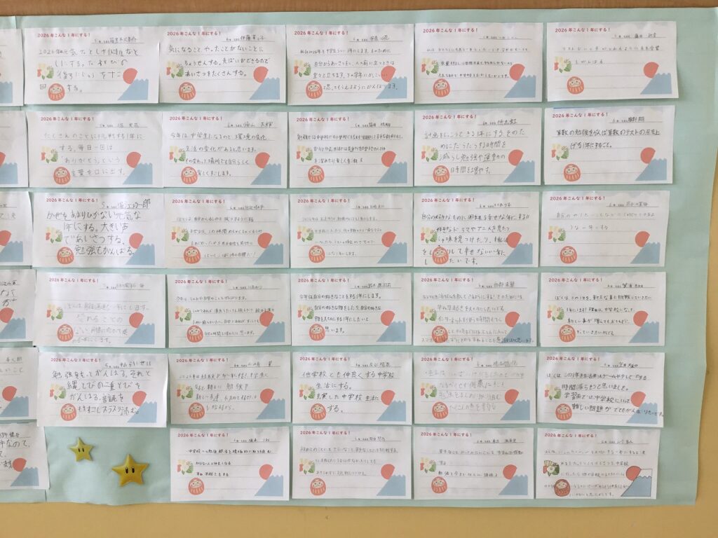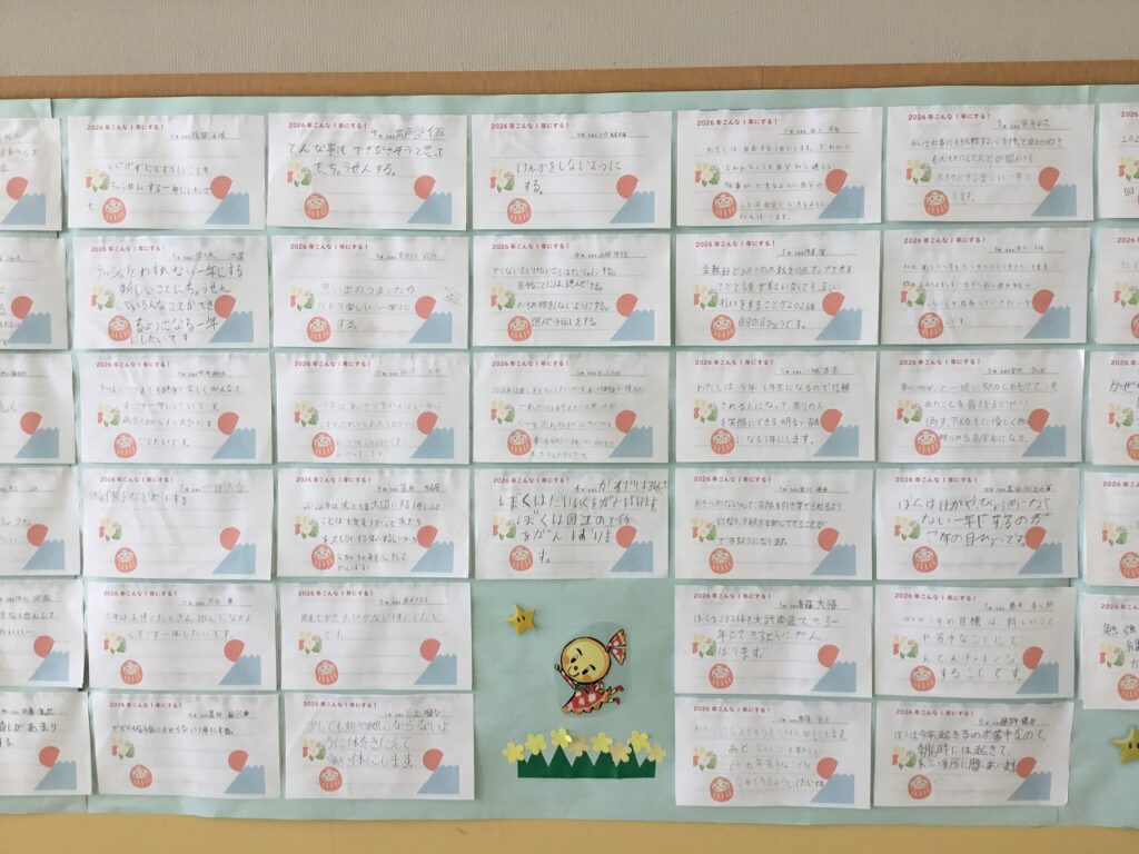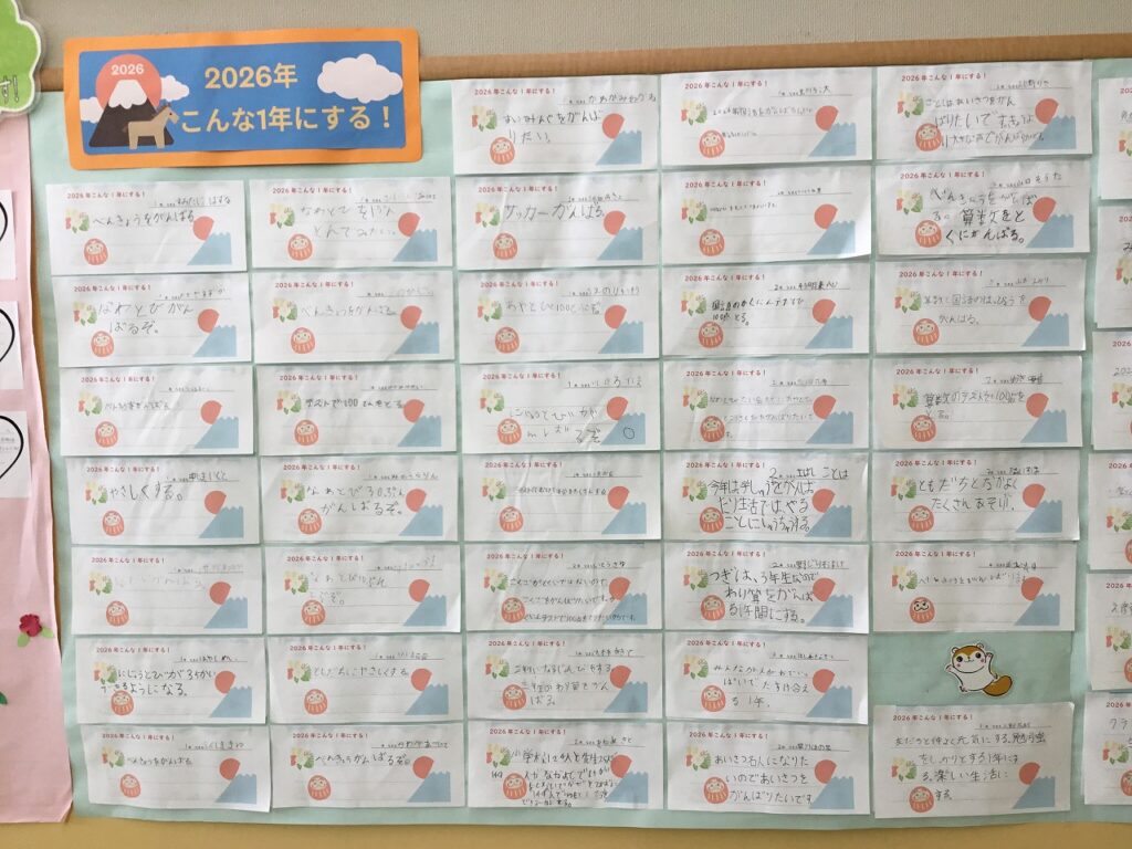 『2026年、こんな1年にする!』という全校児童の目標を掲示しました。どの児童の目標も力強く、目標への熱い思いが感じられるものばかりです。目標を叶えるために努力してほしいと思います。