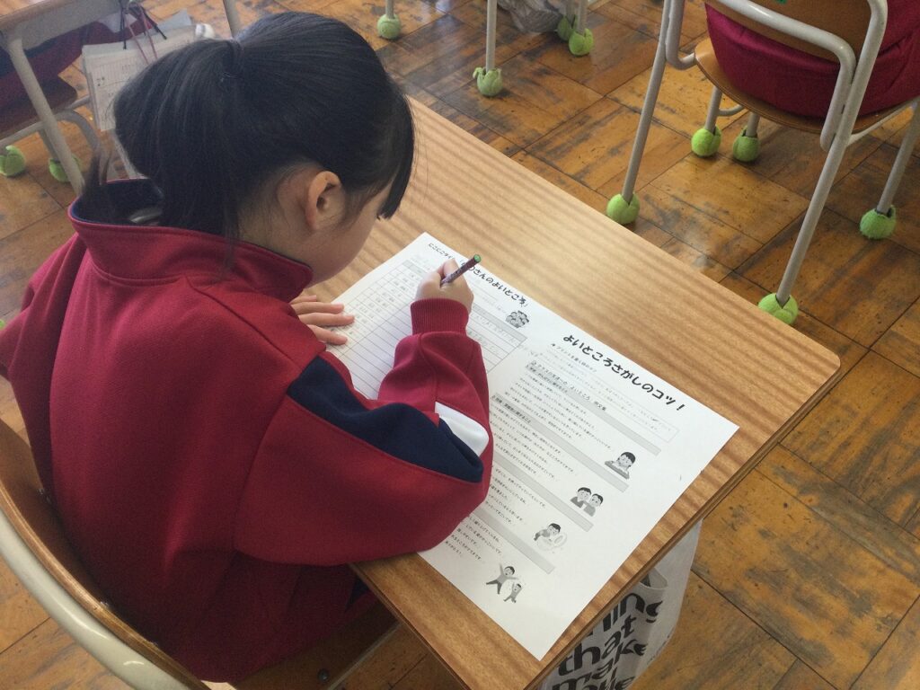 今年度最後の活動は、『友達のよいところさがし』です。来週の伝え合う活動の前に、今日はその準備に取り組みました。この一年、共に過ごした仲間のよいところを探し、一人一人用紙に書いていきます。紙には友達のたくさんのよさが書かれてありました。相手のよさに気づくことのできる子どもたち。そのすばらしさを感じた朝でした。