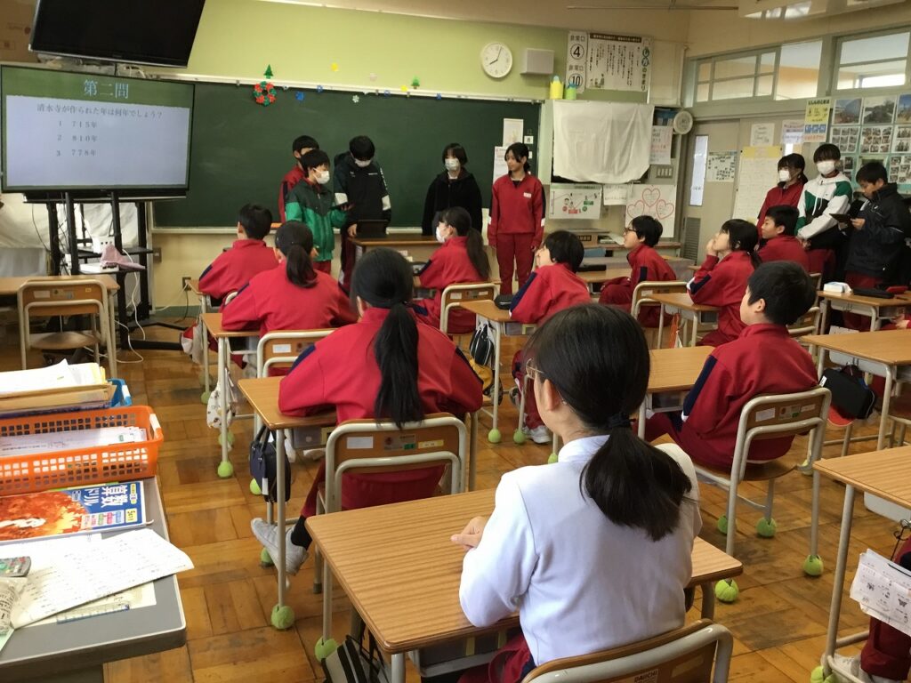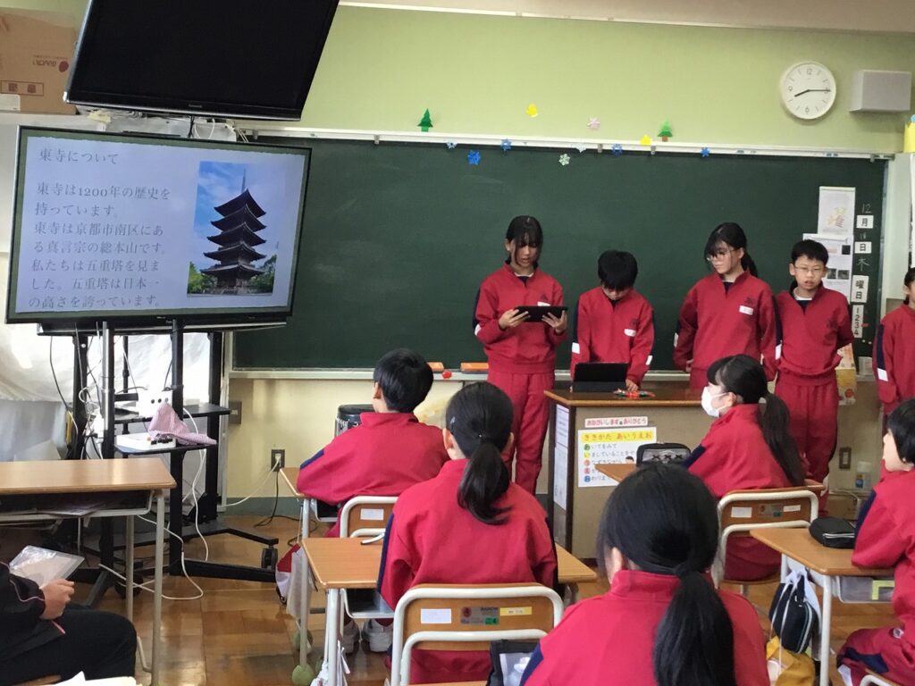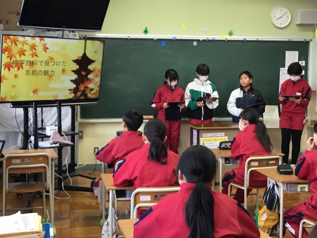 朝活動の時間、6年生が5年生にむけて修学旅行の京都班別研修について発表しました。訪れた神社や寺、そこで知ったことや学んだことをわかりやすく説明しました。発表を真剣に聴いた5年生は、来年の修学旅行が楽しみになったようです。