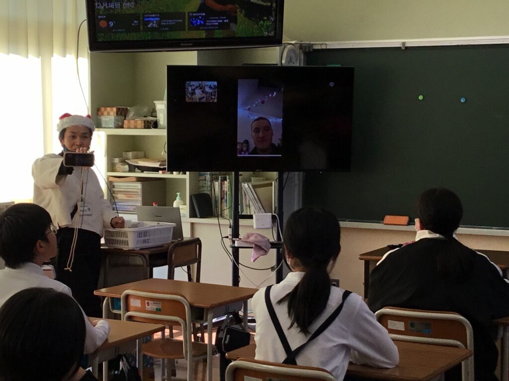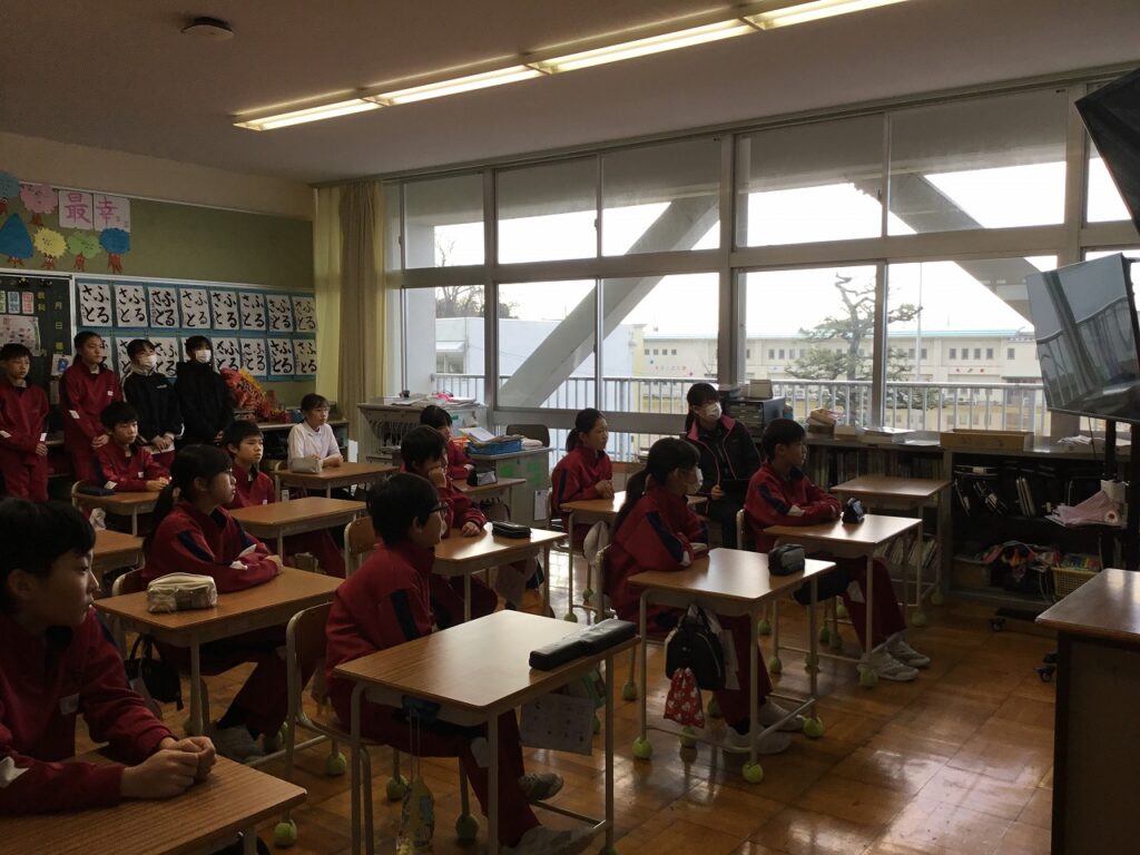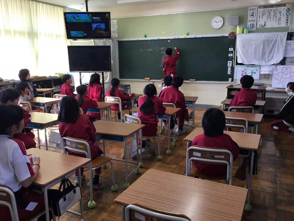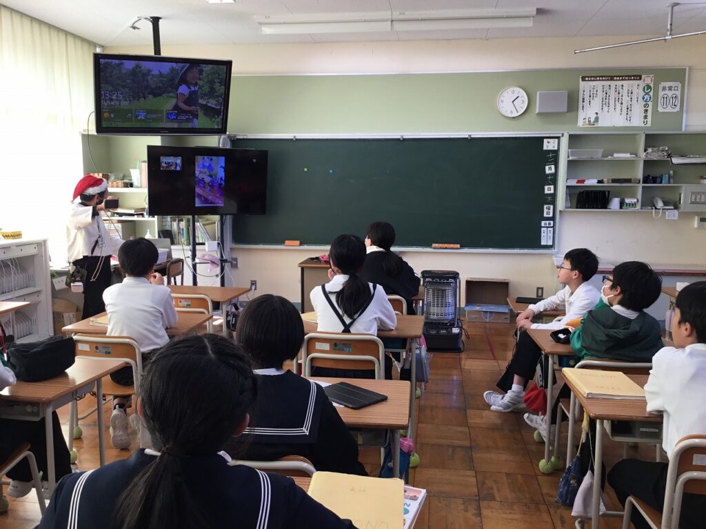 午後の6年生の英語の授業では、アメリカに帰省しているALTの先生とビデオ電話で会話しました。クリスマスを祝う雰囲気が伝わってきて、6年生は興味津々の様子でした。