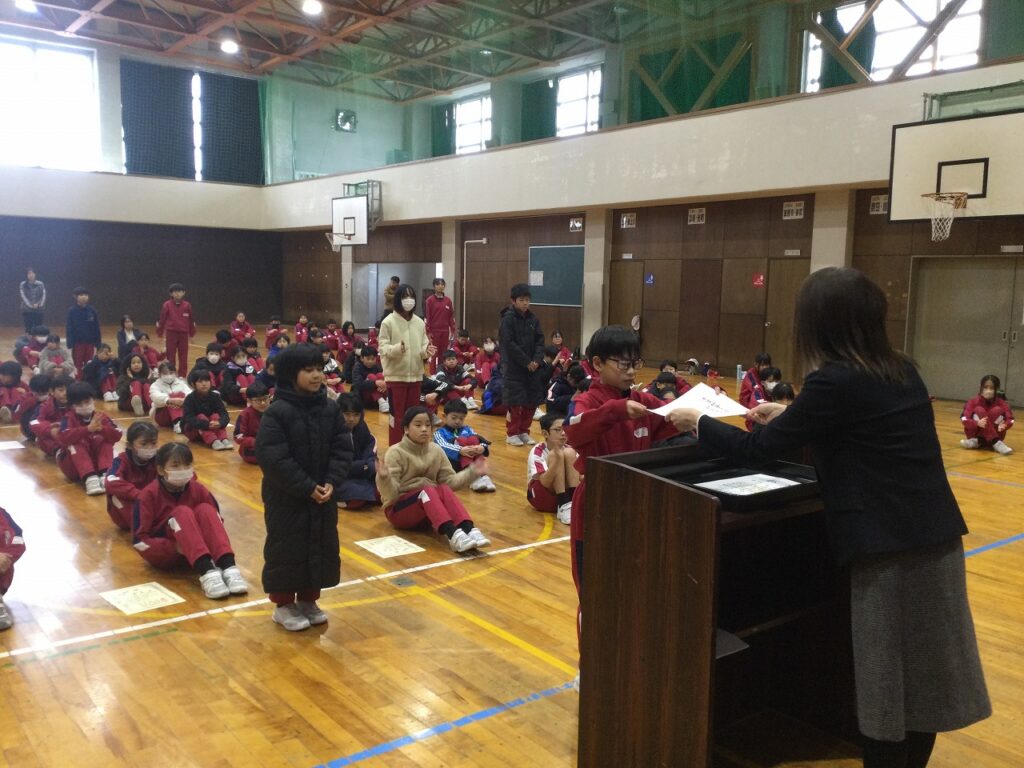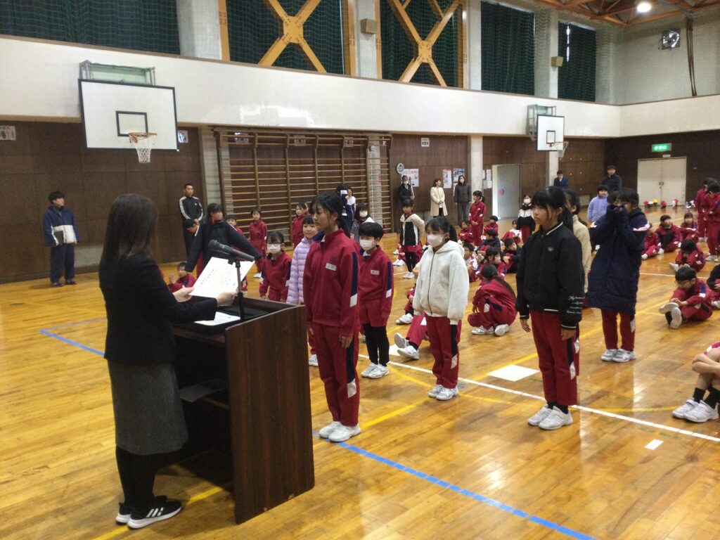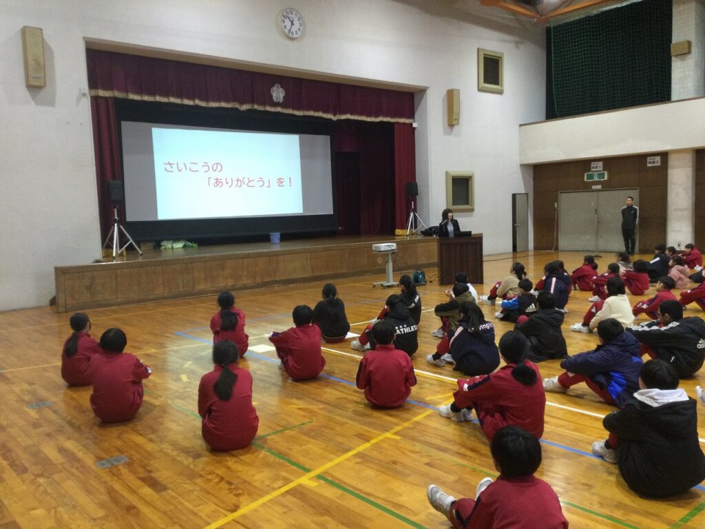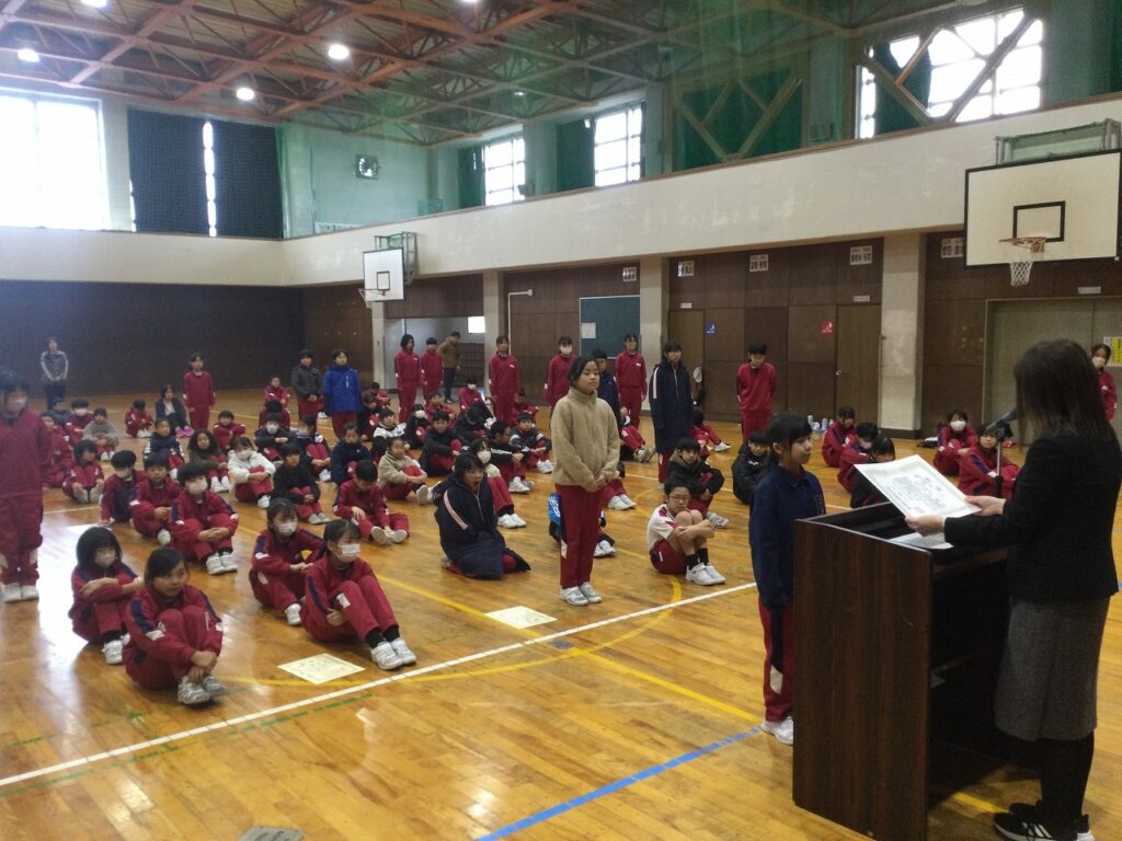 Qタイムに今年度最後の全校集会を行いました。はじめに、毎日、お世話になっている用務員さんへの感謝を込めて、全校児童からの”ありがとうメッセージ”を送りました。これは、給食放送委員会の子どもたちが考えた企画です。