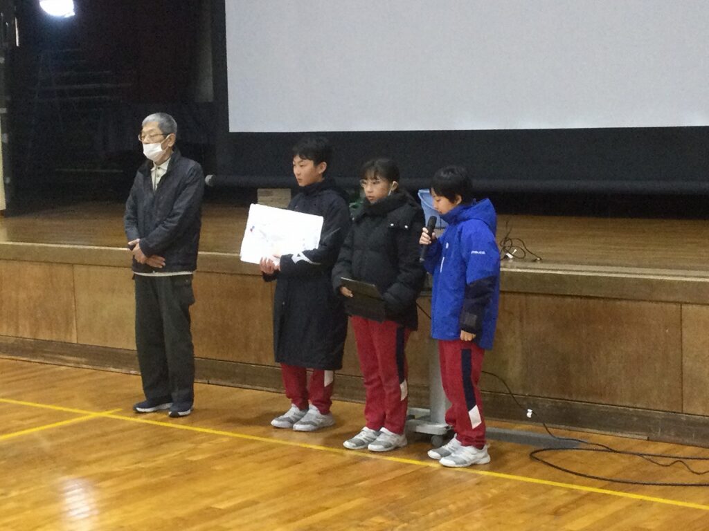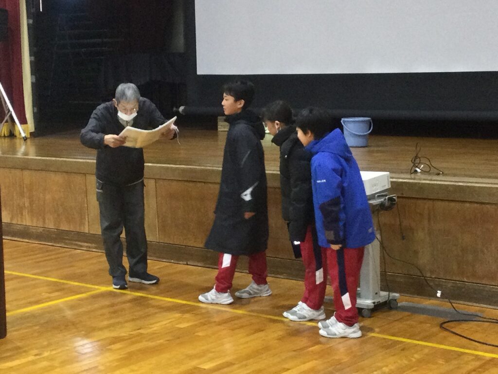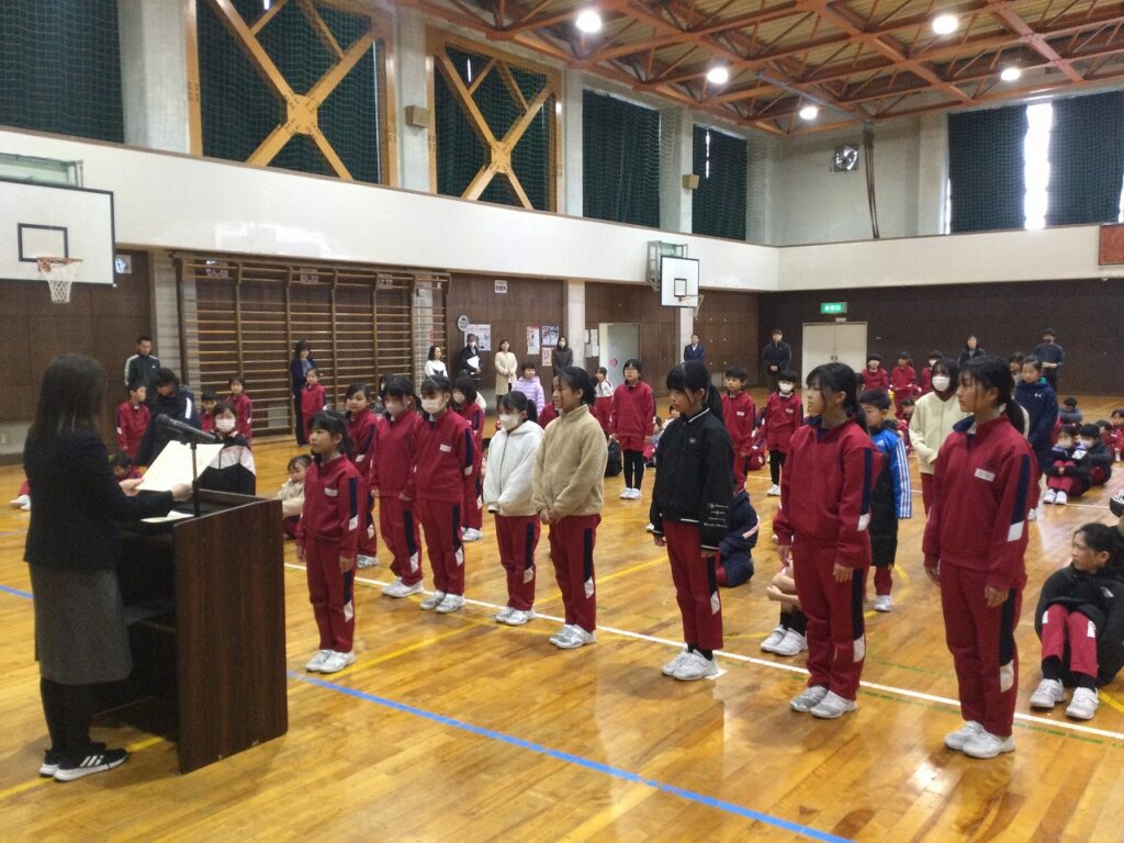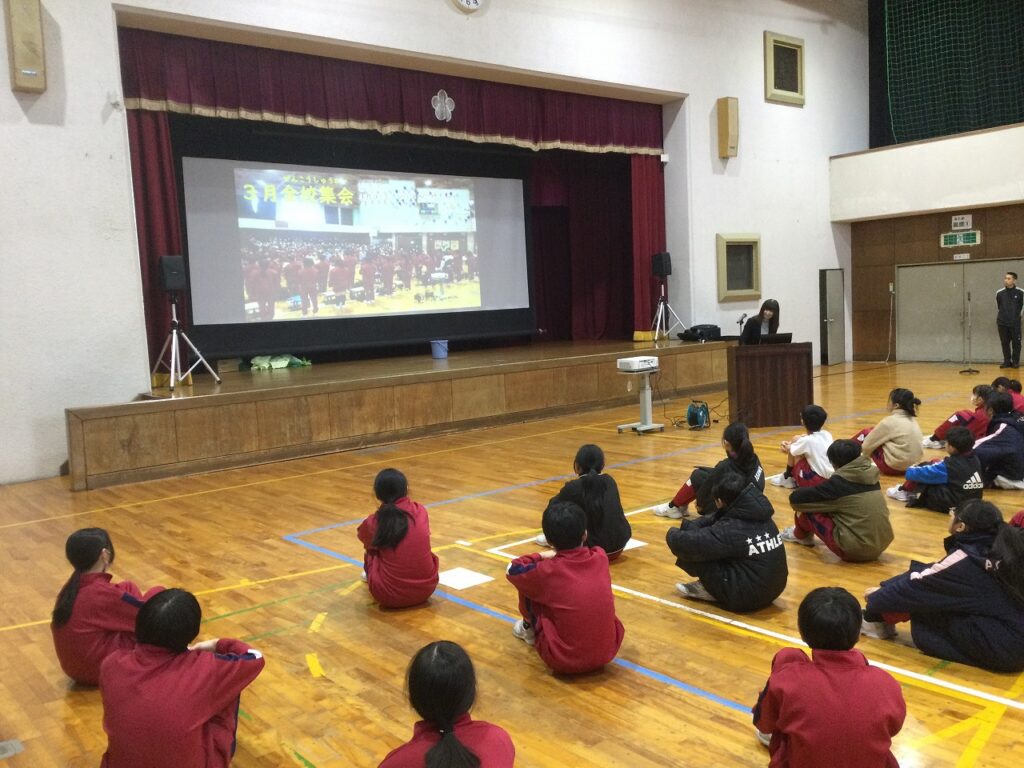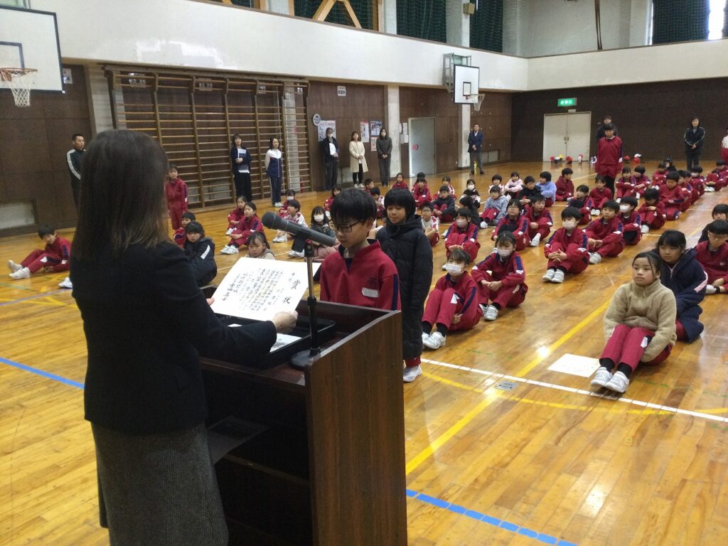 Qタイムに今年度最後の全校集会を行いました。はじめに、毎日、お世話になっている用務員さんへの感謝を込めて、全校児童からの”ありがとうメッセージ”を送りました。これは、給食放送委員会の子どもたちが考えた企画です。