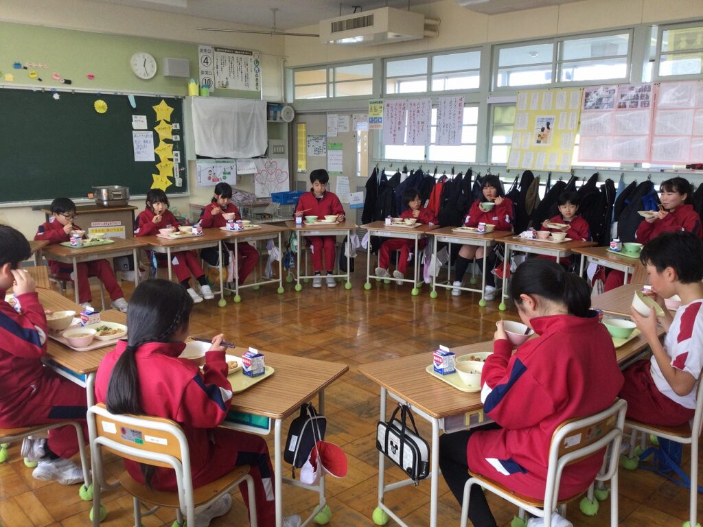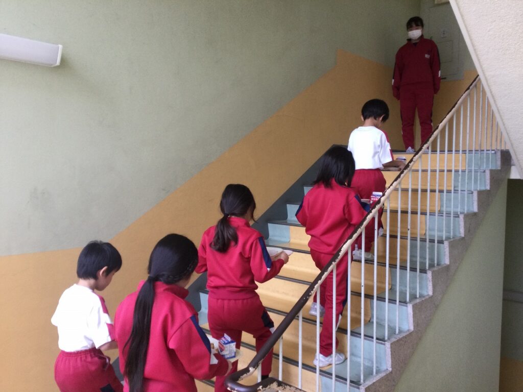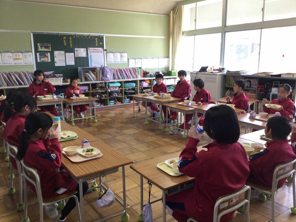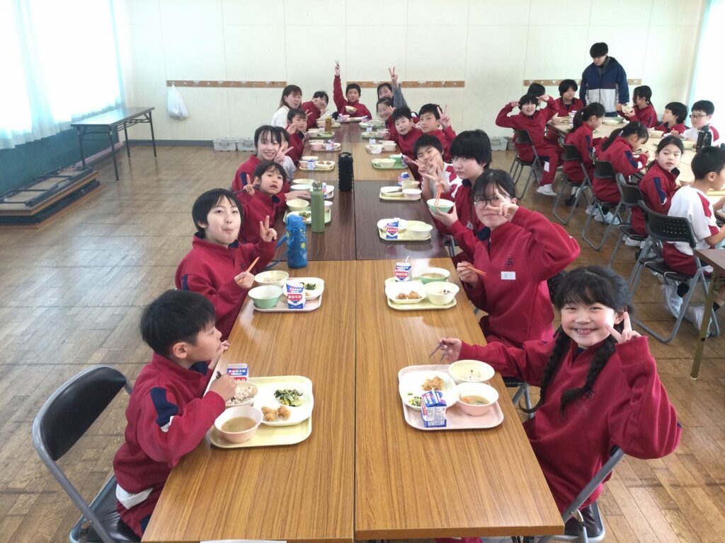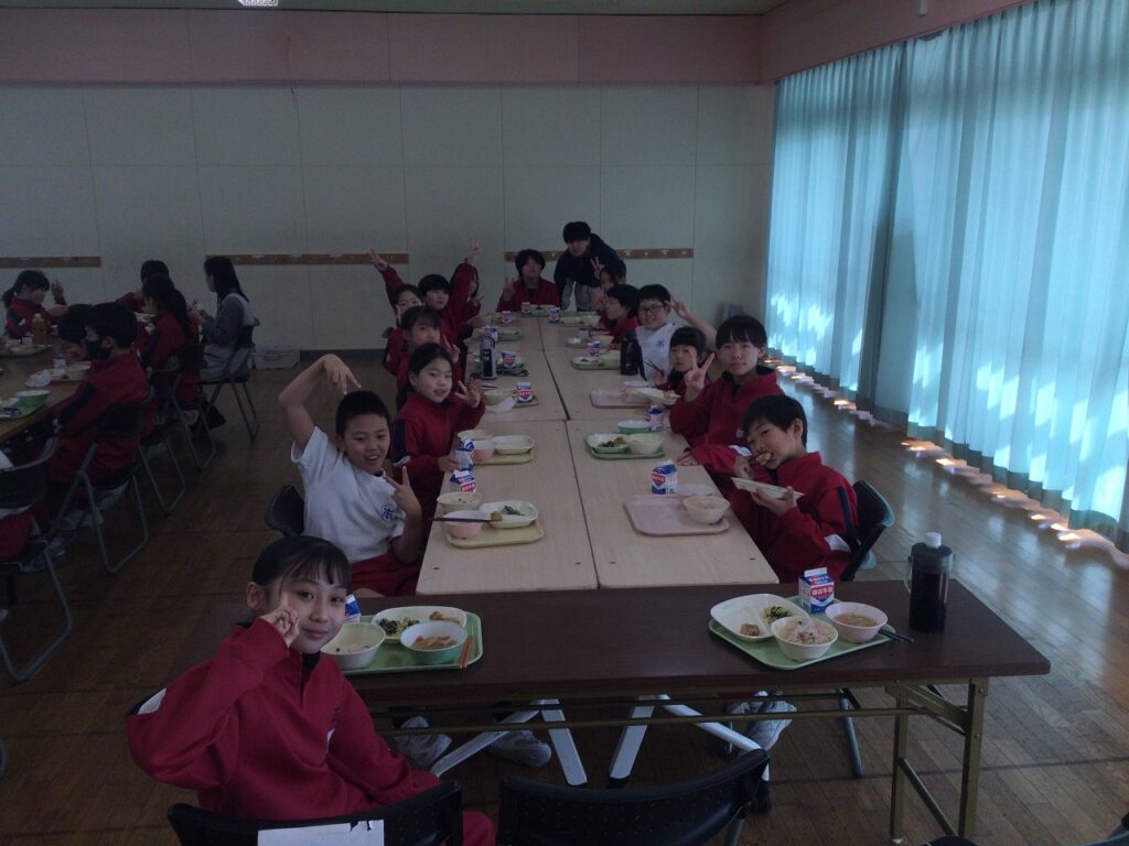 今日の給食は、『縦割り給食』でした。このアイディアも子どもたちから出たものです。給食を運ぶときは、高学年がやさしく見守りました。縦割り班ごとに、1年生から6年生で楽しく給食をいただきました。また一つ、子どもたちの願いが叶いました。