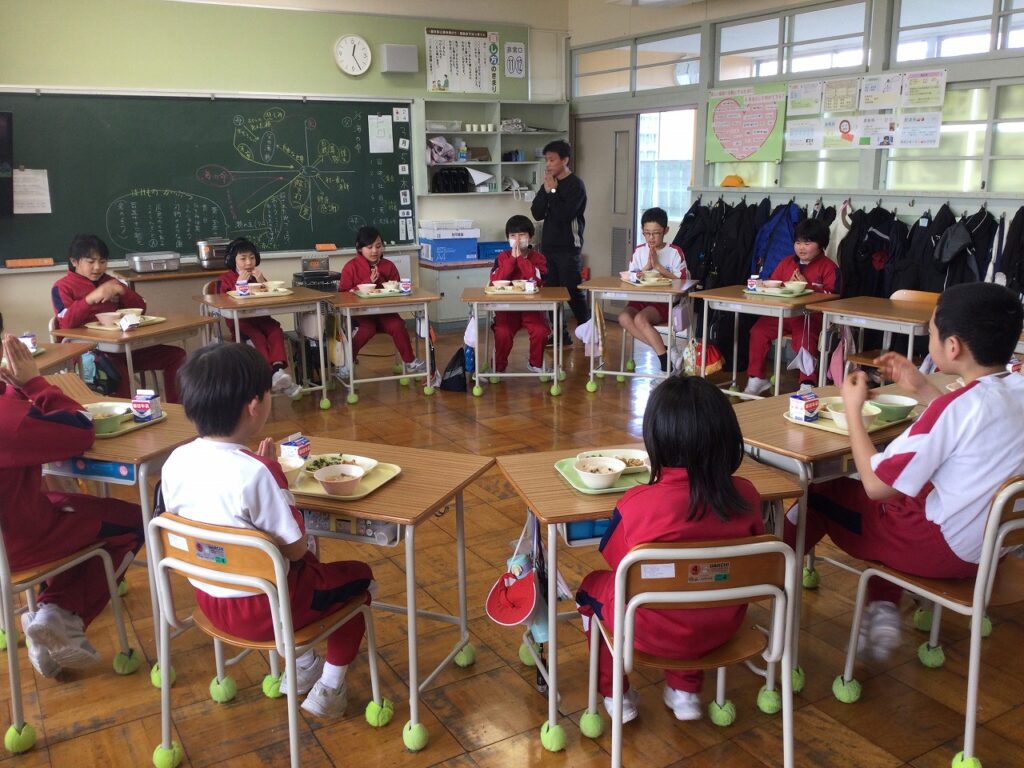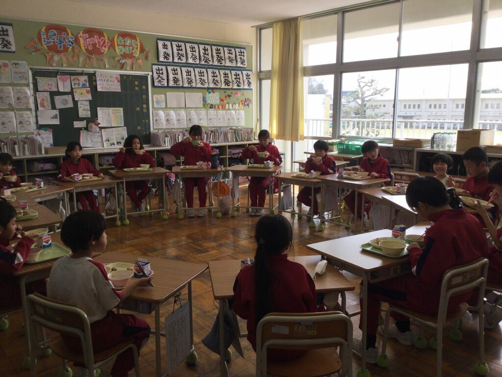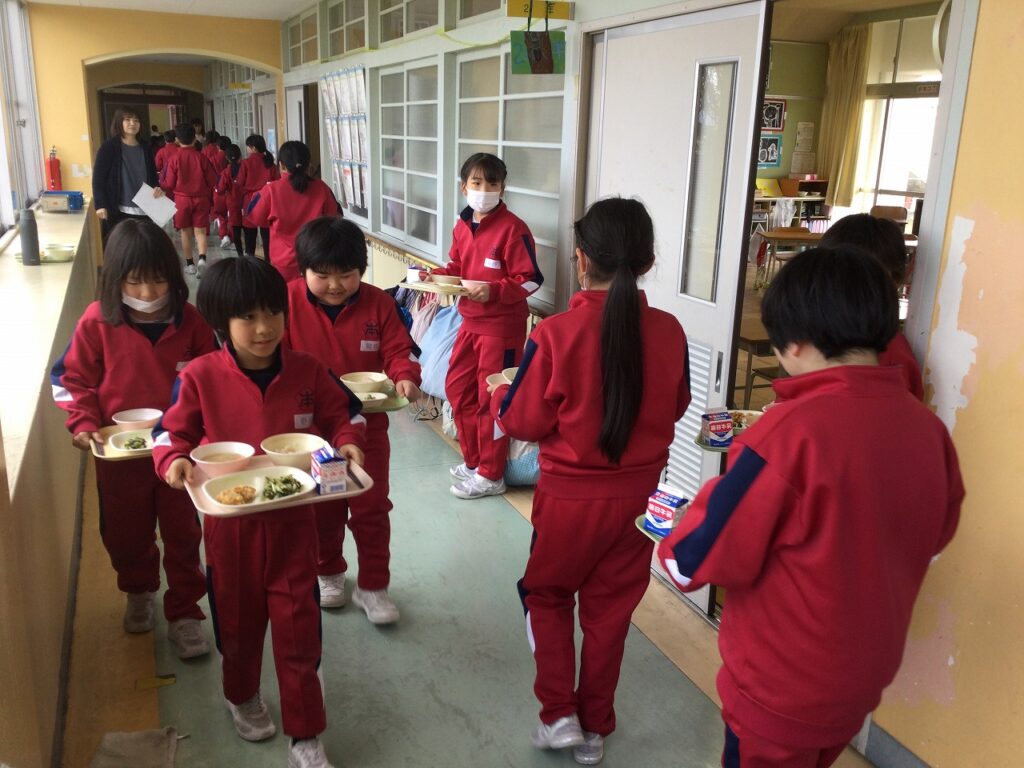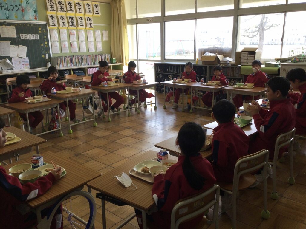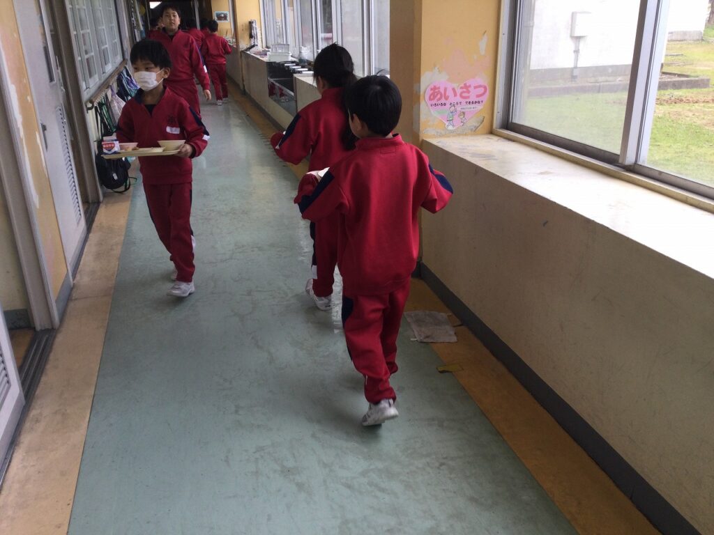 今日の給食は、『縦割り給食』でした。このアイディアも子どもたちから出たものです。給食を運ぶときは、高学年がやさしく見守りました。縦割り班ごとに、1年生から6年生で楽しく給食をいただきました。また一つ、子どもたちの願いが叶いました。