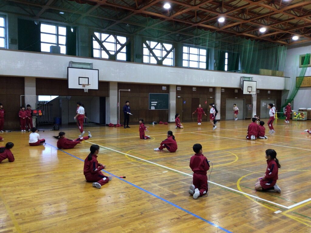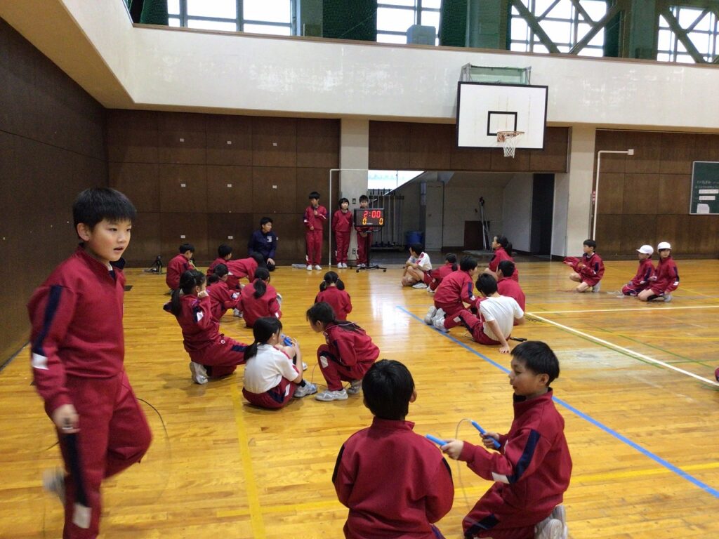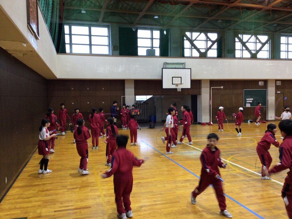 計画体育委員会が考えた、なわとびのユニーク企画が今日から始まりました。『団体戦二重とびサバイバル』と題したこの企画は、3人1チームで、長く跳び続けられるかを競います。2年生から6年生までの13チームが参加しました。寒い時期ですが、高学年のアイディアで、体も温まり、楽しい時間を過ごすことができました。