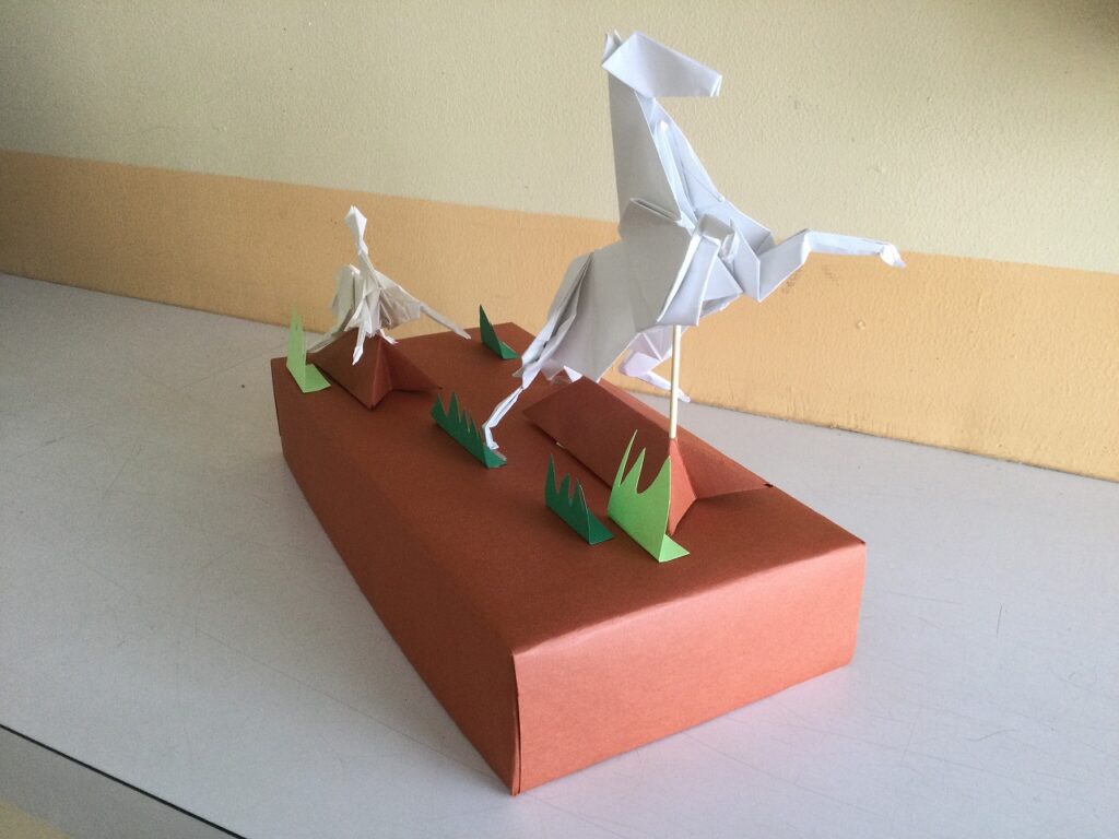 今年は午年。手先のとても器用な児童が、玄関に飾る午の置物を作って届けてくれました。親子の2頭の馬が、まるで野原を駆けまわっているかのようです。