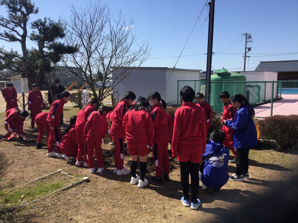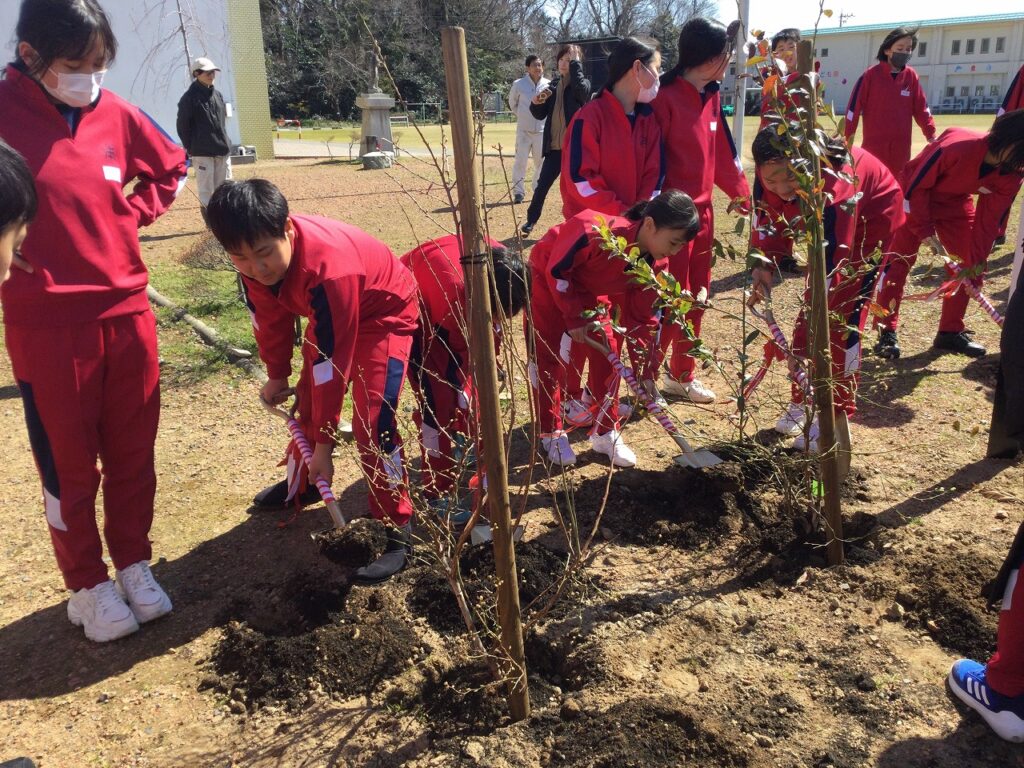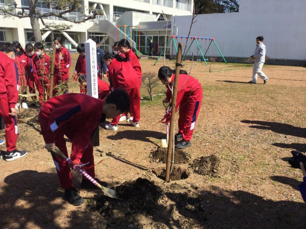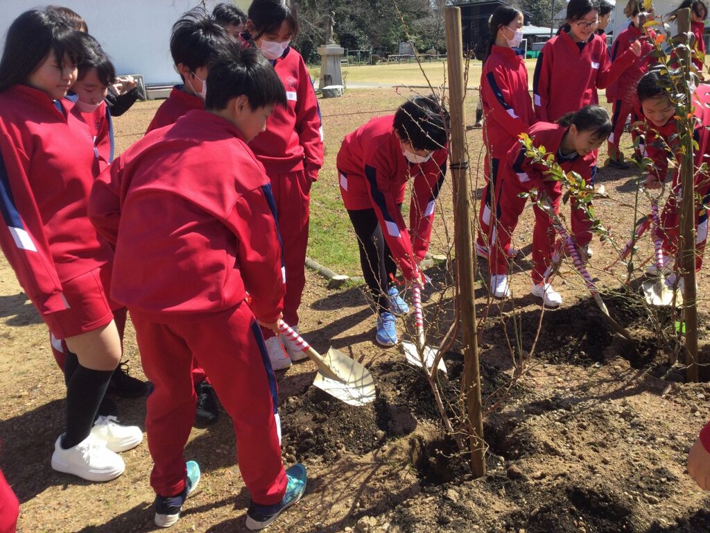 緑の募金事業「環境緑化事業」の一環として、卒業を迎える6年生が記念植樹を行いました。中庭に、いちじくとブルーベリーの木、3本を植樹しました。6年間、お世話になった学校への感謝を形にできたよい機会となりました。