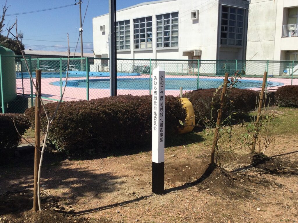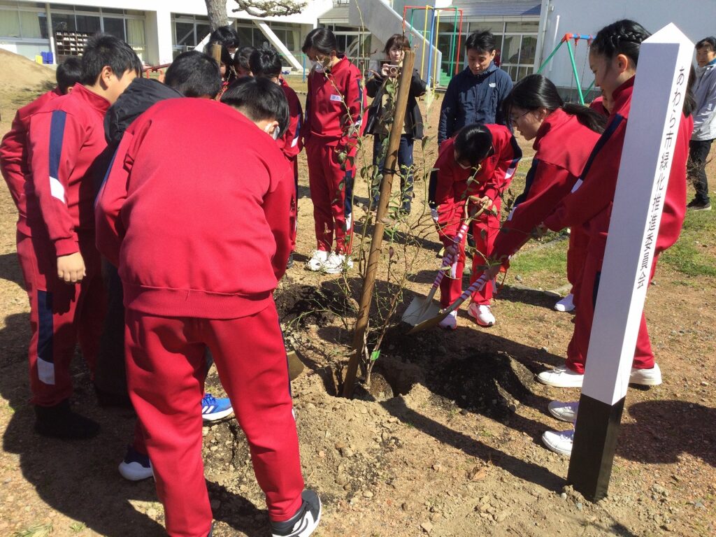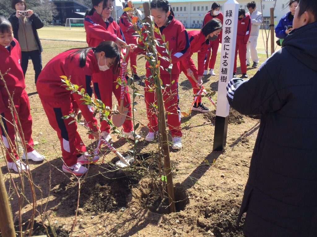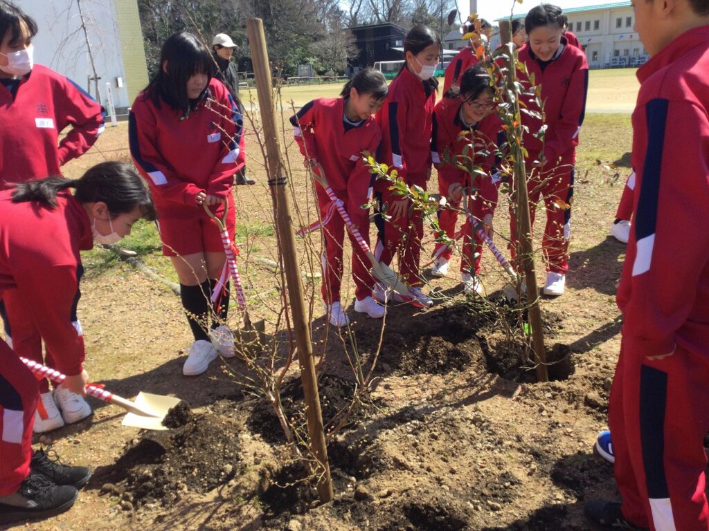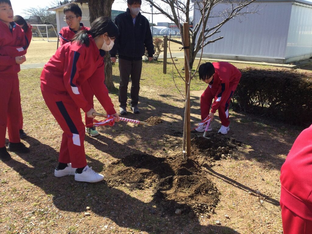 緑の募金事業「環境緑化事業」の一環として、卒業を迎える6年生が記念植樹を行いました。中庭に、いちじくとブルーベリーの木、3本を植樹しました。6年間、お世話になった学校への感謝を形にできたよい機会となりました。
