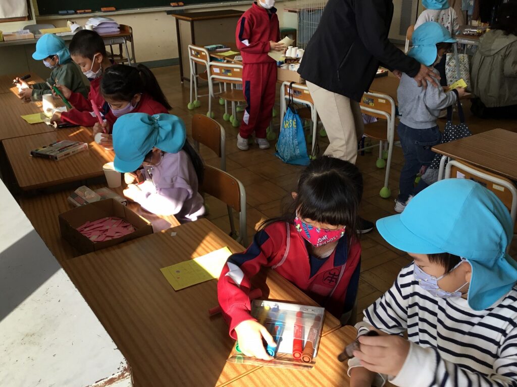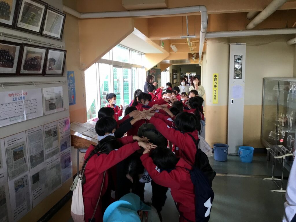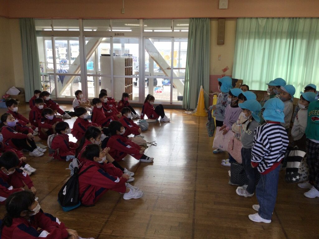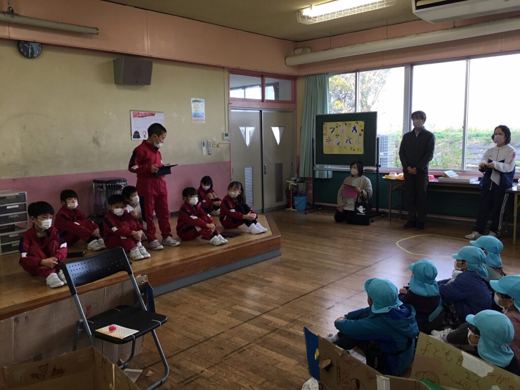 おわりの会では、感想を伝え合いました。年長組の園児たちに楽しんでもらえた1、2年生は、とてもうれしそうでした。最後には1、2年生でアーチを作って見送りました。