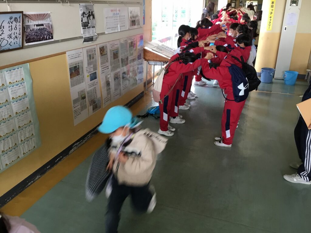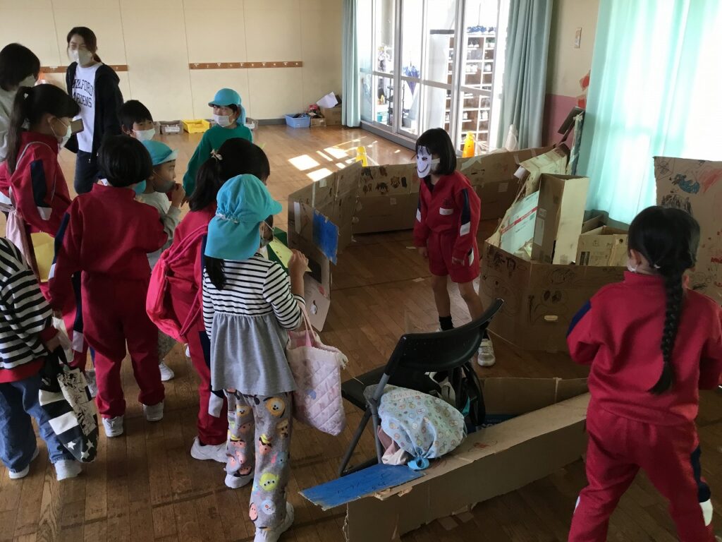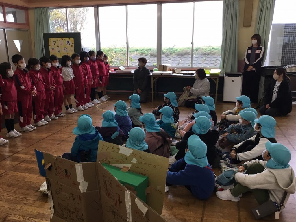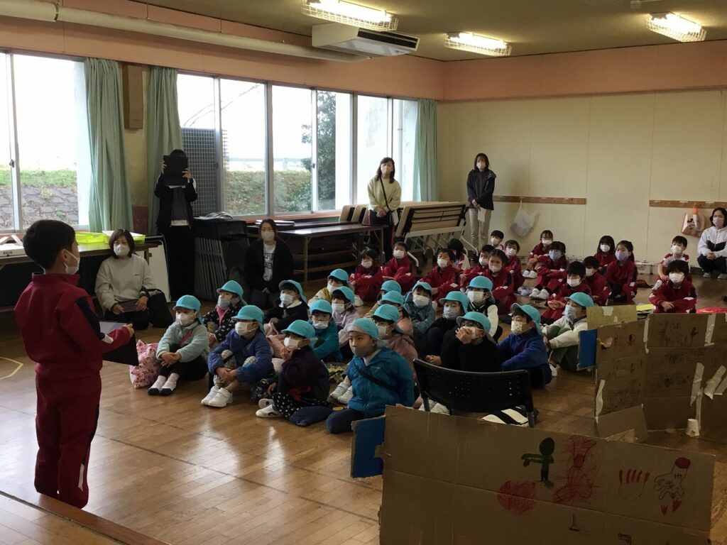 おわりの会では、感想を伝え合いました。年長組の園児たちに楽しんでもらえた1、2年生は、とてもうれしそうでした。最後には1、2年生でアーチを作って見送りました。
