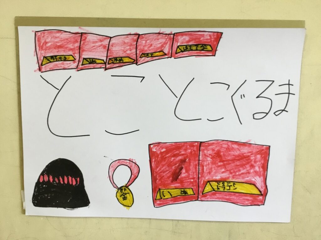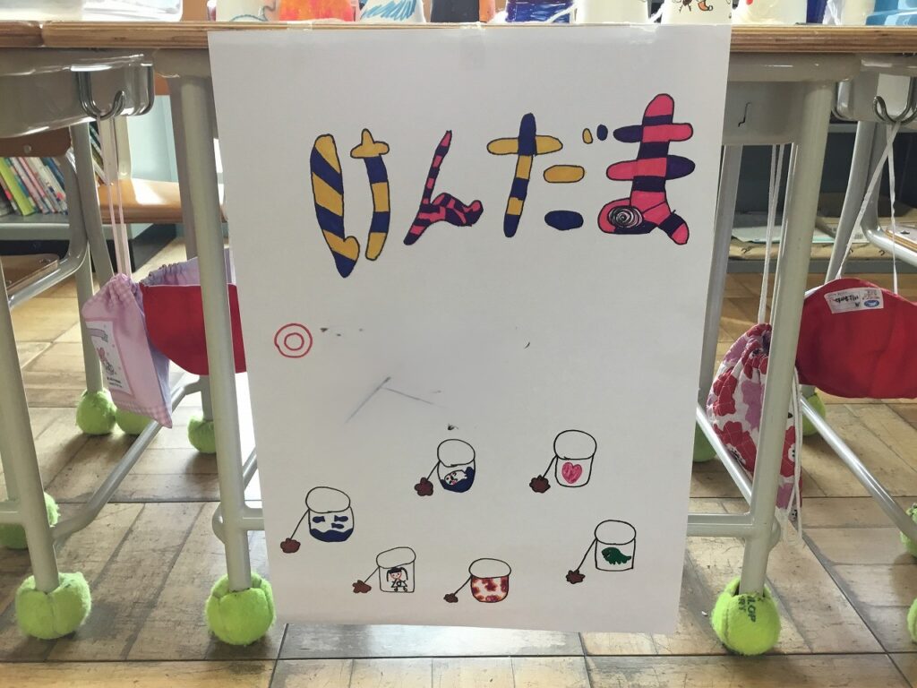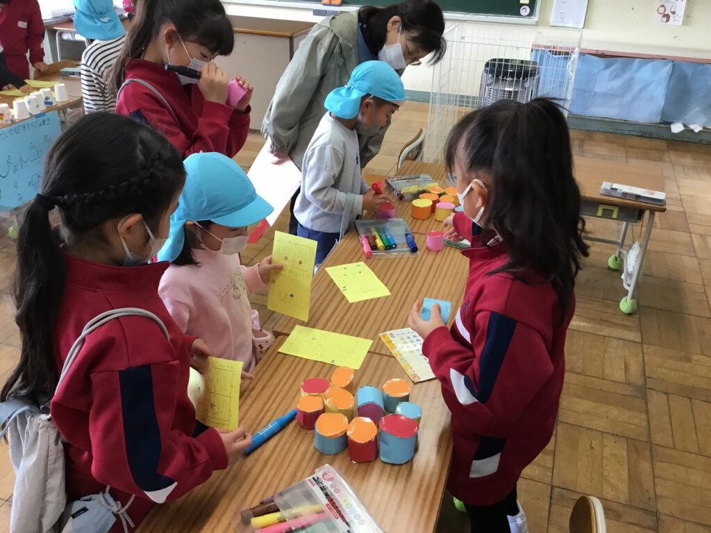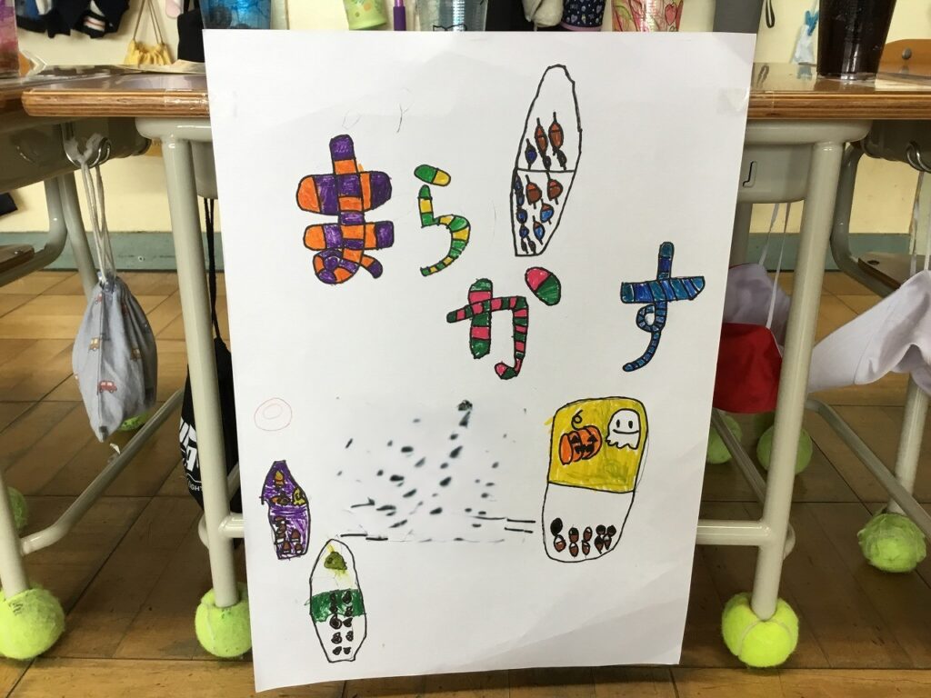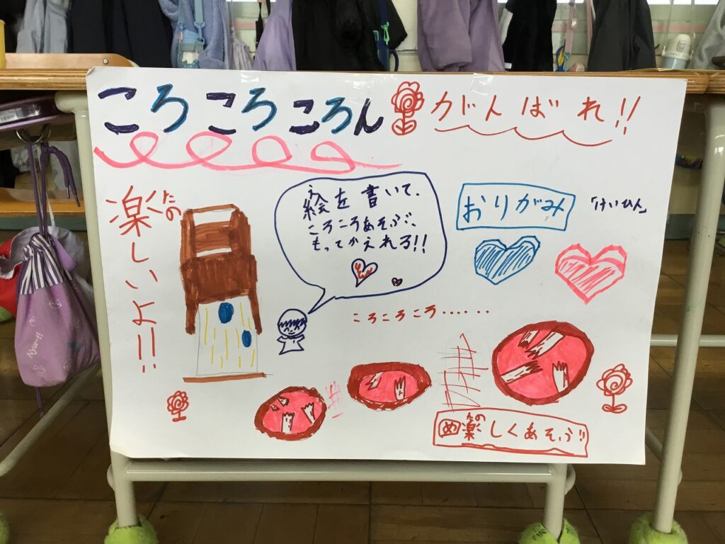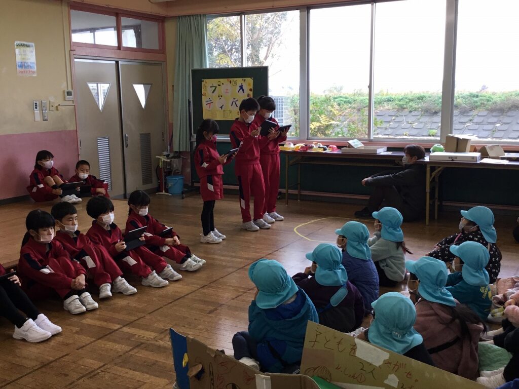 昨日は、1、2年生がフェスティバルを開き、こども園の年長組さんを招待しました。はじめの会は2年生が進行しました。その後、1年生、2年生が準備したそれぞれのお店について紹介しました。