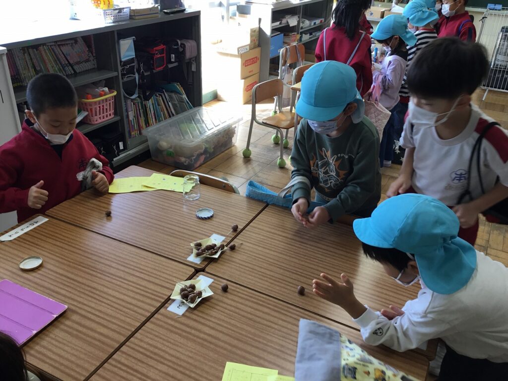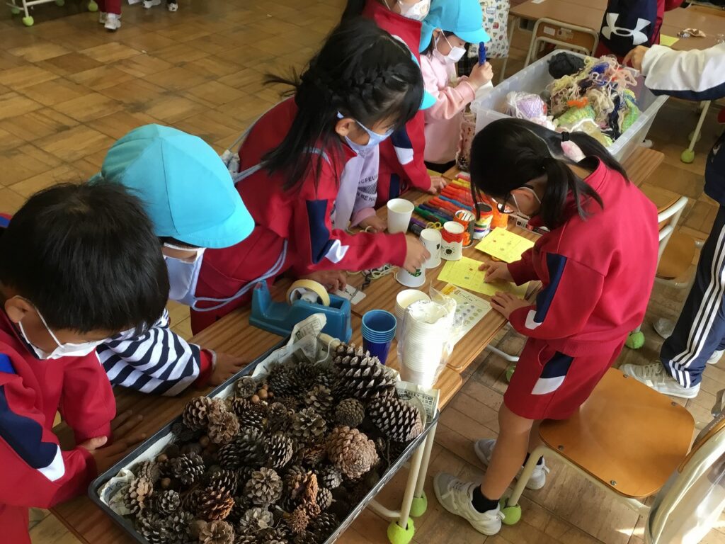 いよいよ小学生と園児がペアになってお店を楽しむ時間です。1年生は秋探しで拾ってきたどんぐりや松ぼっくりを用いたお店を考えました。