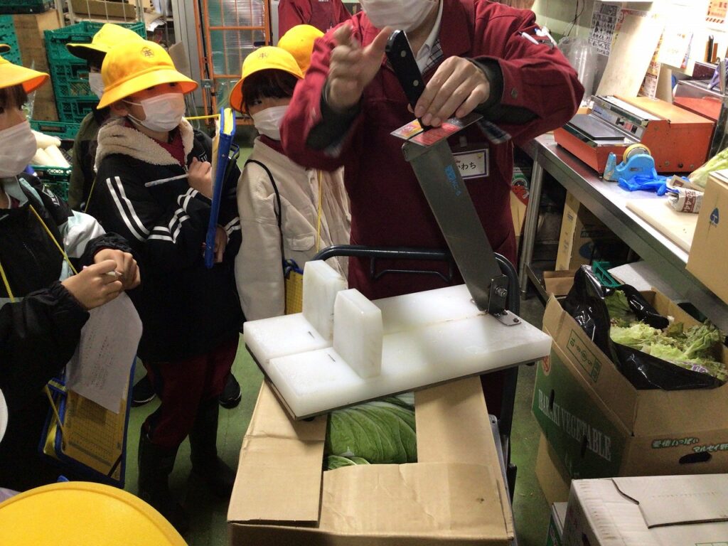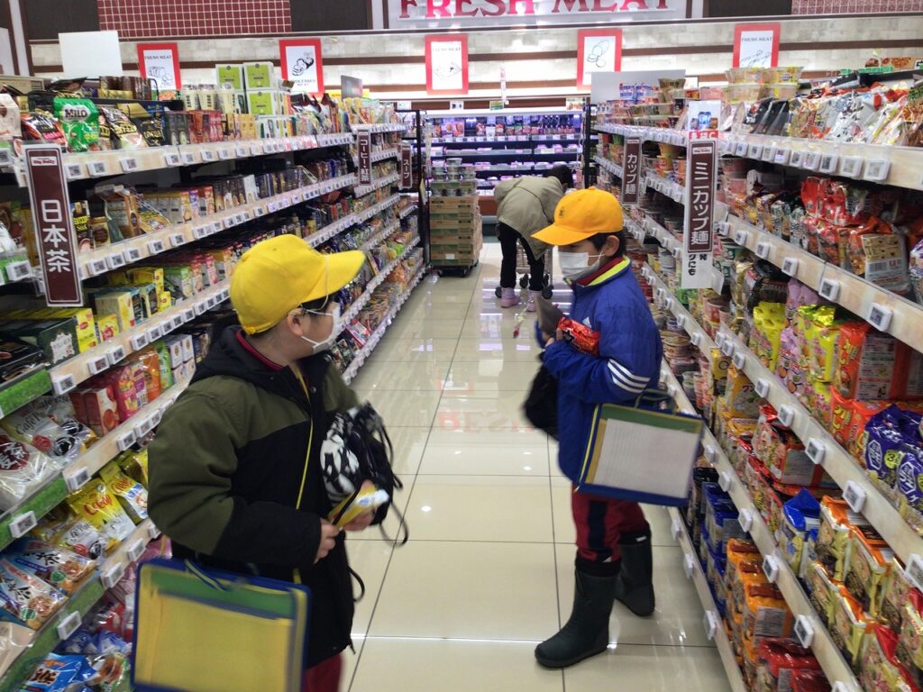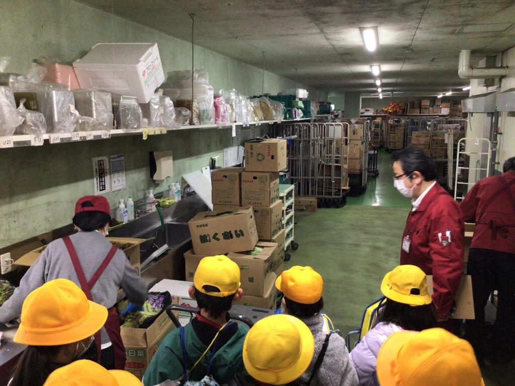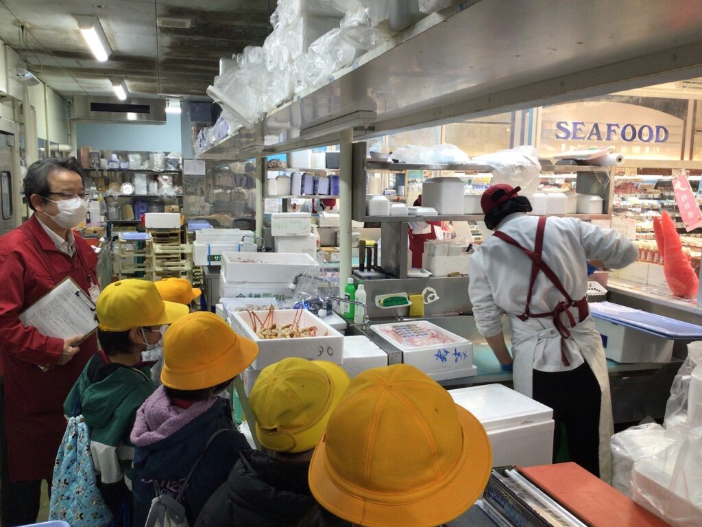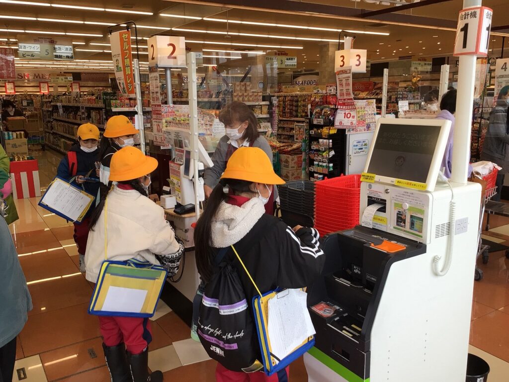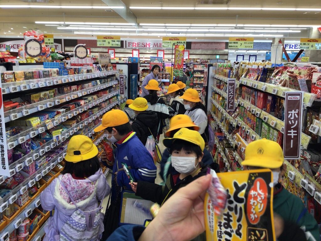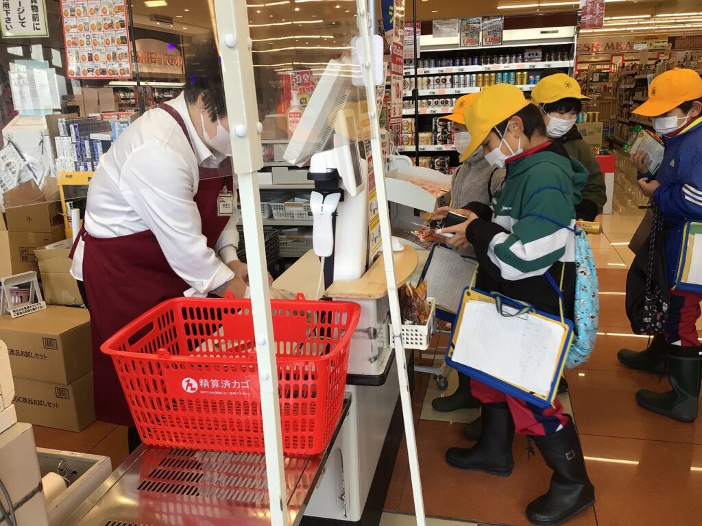 スーパーマーケットでは、売り場や、普段見ることのできないバックヤードを見学させていただきました。商品の位置をわかりやすく示すための看板や値段表示のポップなど、お店には様々な工夫がされていることを学びました。最後に、お家の人と相談した商品を買う体験も行いました。