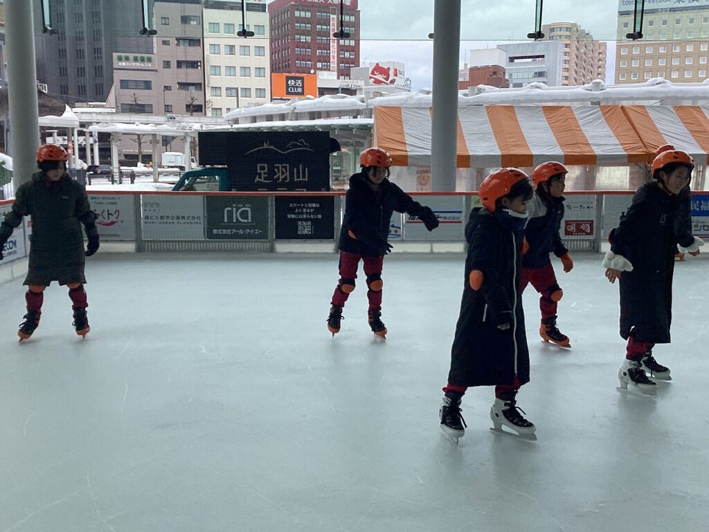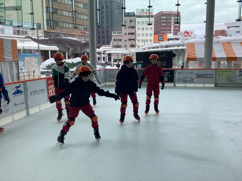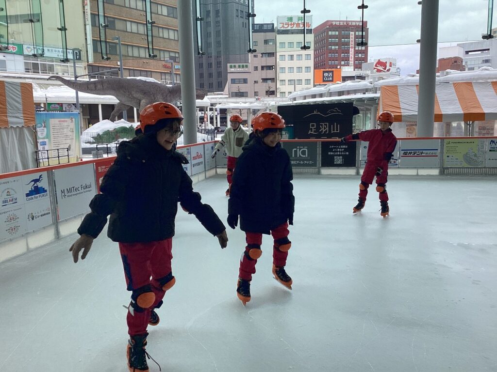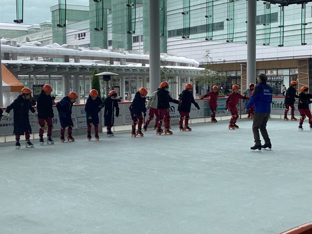 次に、ハピテラスでスケートを楽しみました。スケートをするのは初めての子どもたちもいました。始めは恐る恐る滑っていた子どもたちも、練習するにつれ上手に滑ることができていました。