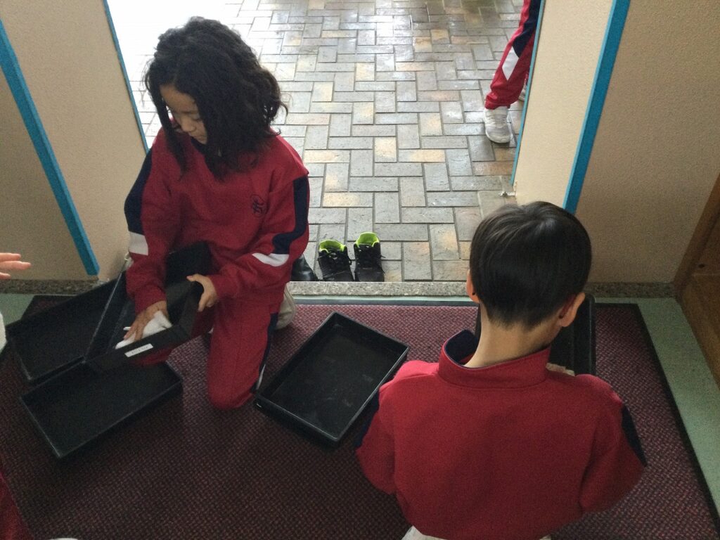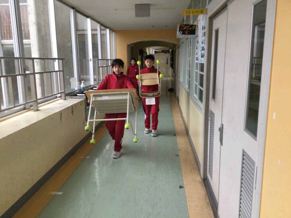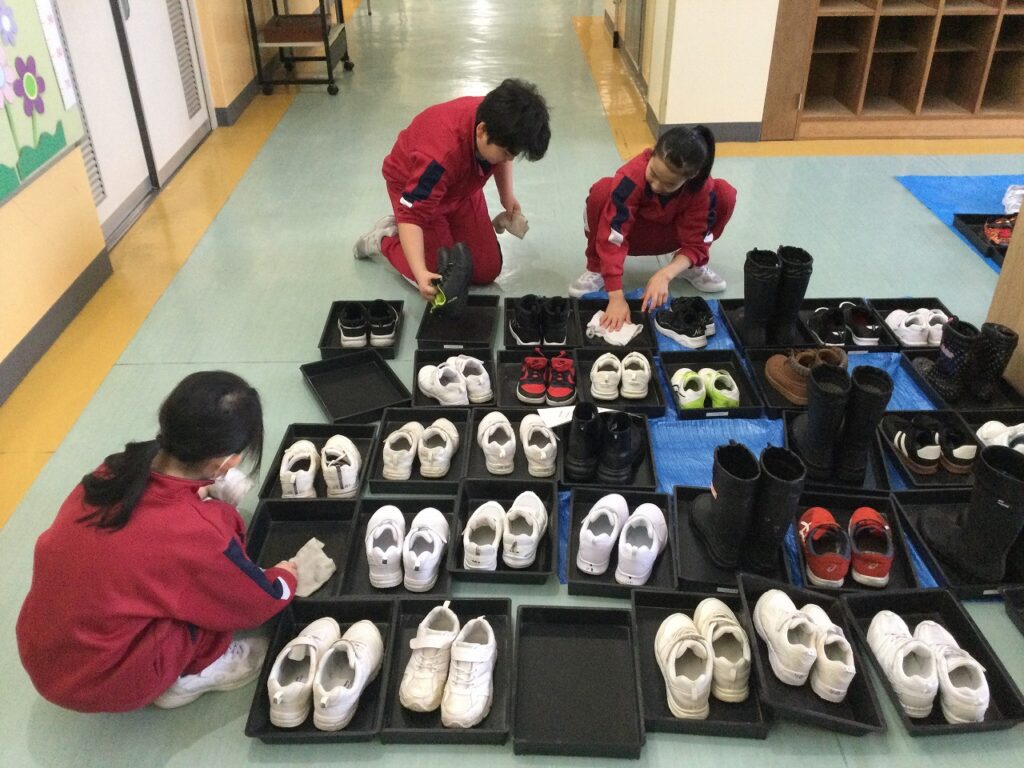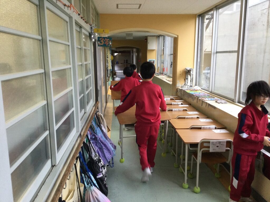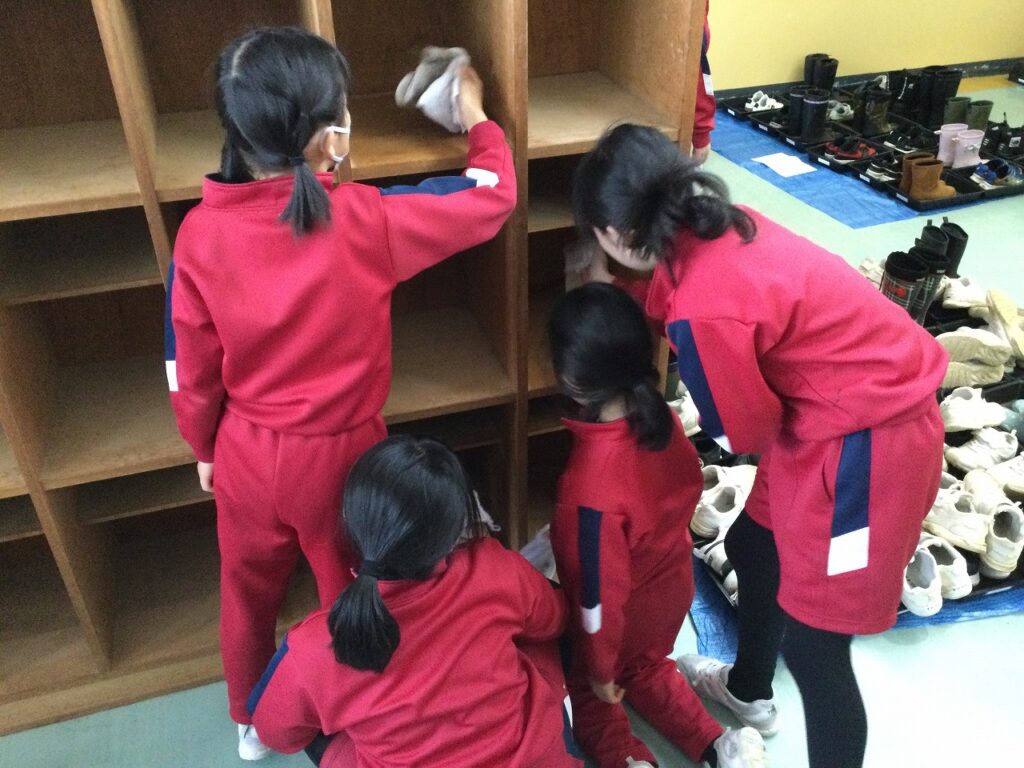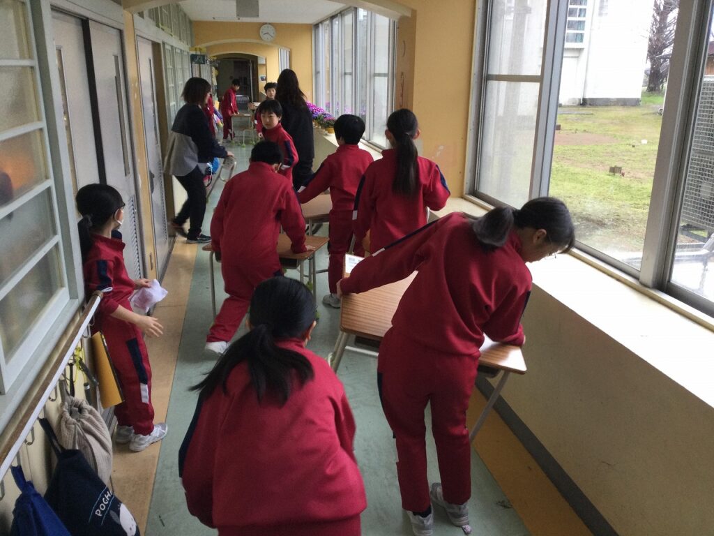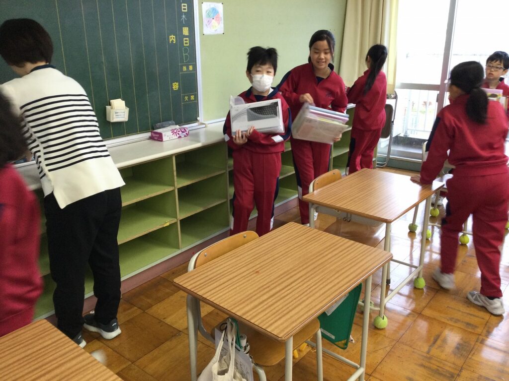 今日は、どの学年も新しい教室への移動を行いました。5年生が必要な机と椅子を各教室に運び終えた後、他の学年が順番に次の学年の教室へと移動しました。一年間お世話になった教室や下足箱の掃除も、全員で協力して行いました。
