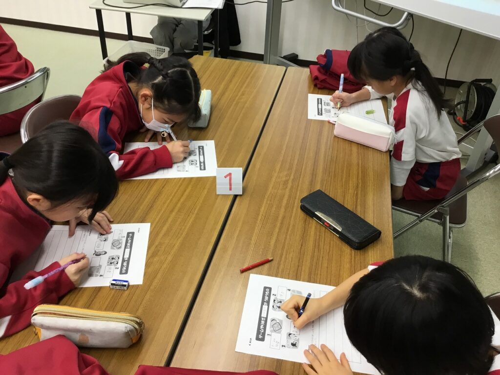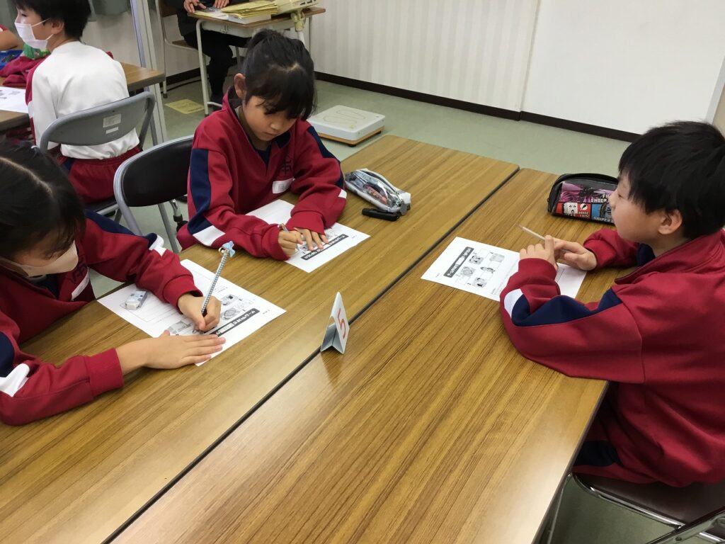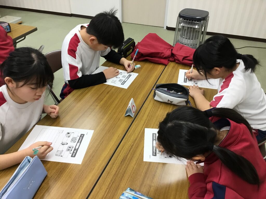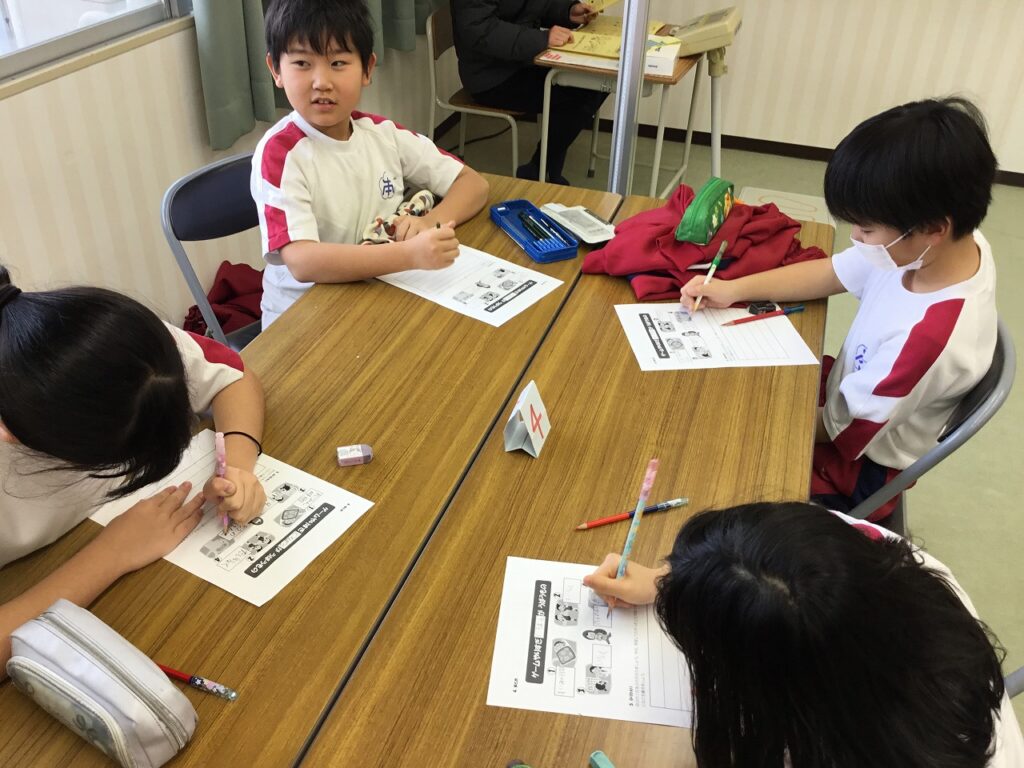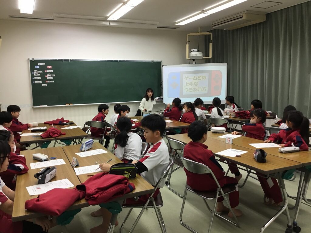 3年生はテーマ『生活』のうちの「ゲームとのじょうずなつきあい方」についての学習でした。”ゲームやりすぎどろぼう”が、睡眠時間、体力、視力、脳のはたらきの4つの大切なものをうばうことを子どもたちは知りました。