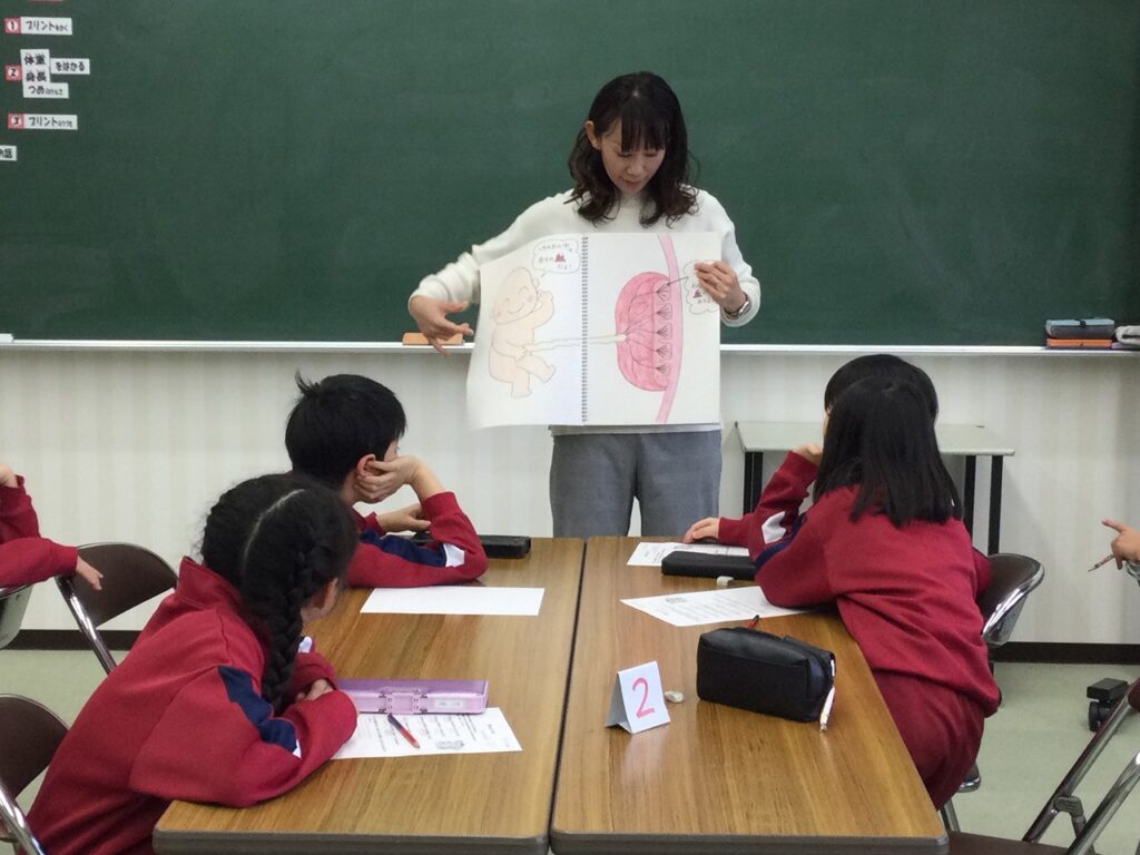 発育測定2日目です。今日は1年生、2年生、3年生が行いました。1年生は、テーマ『5つの感じる力:五感』のうちの「きくちから」について学習しました。耳は音を感じたり、体のバランスをとったりする大切なはたらきがあることを学びました。(写真が撮れず申し訳ありません)2年生は、4年生と同様、テーマ『いのち』のうちの「赤ちゃんのなぞ」について学習しました。