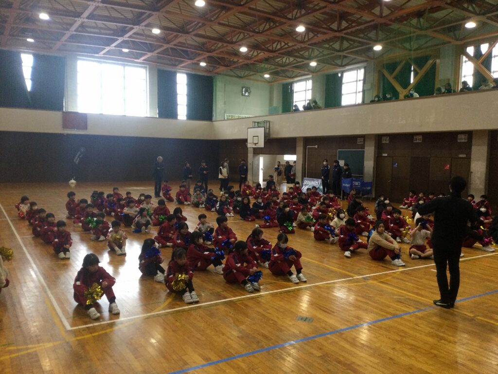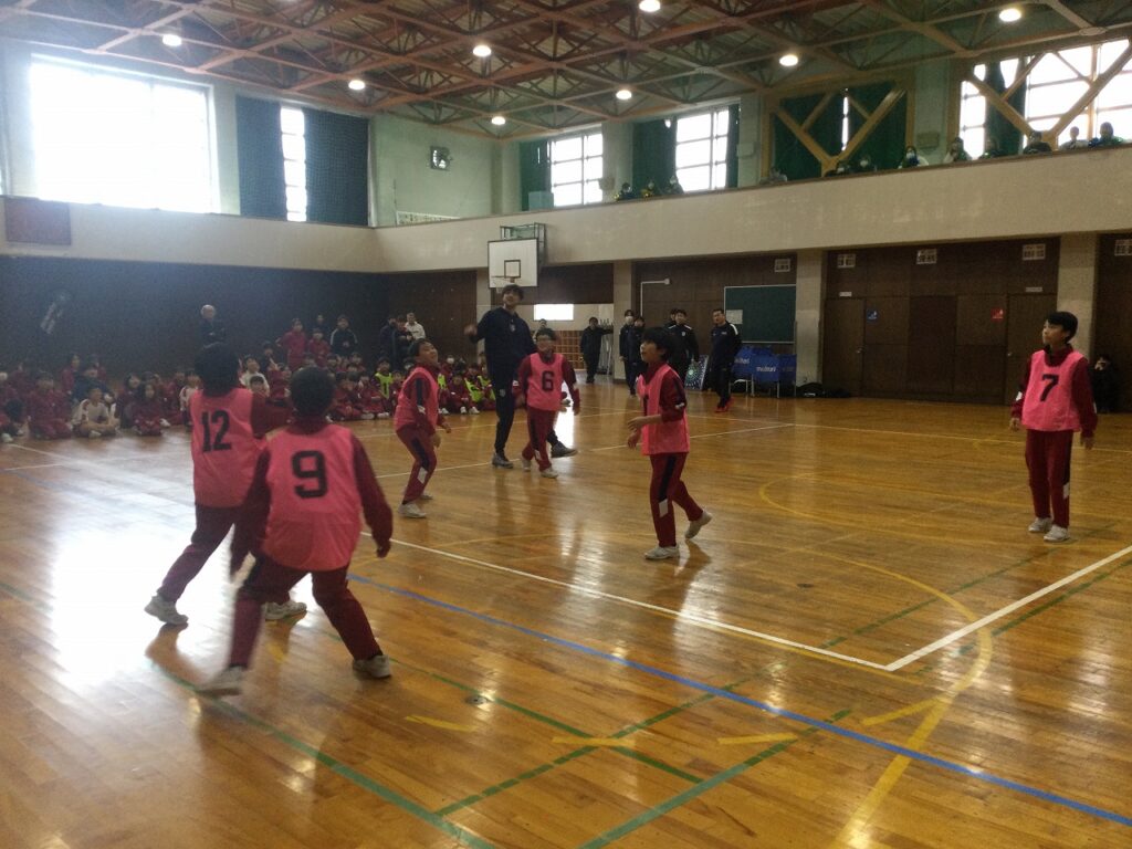 シュート体験のあと、選手とのミニゲームを行いました。最初は、2、3年生チーム。子どもたちは両チームに大きな声援を送りました。