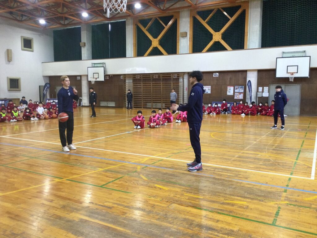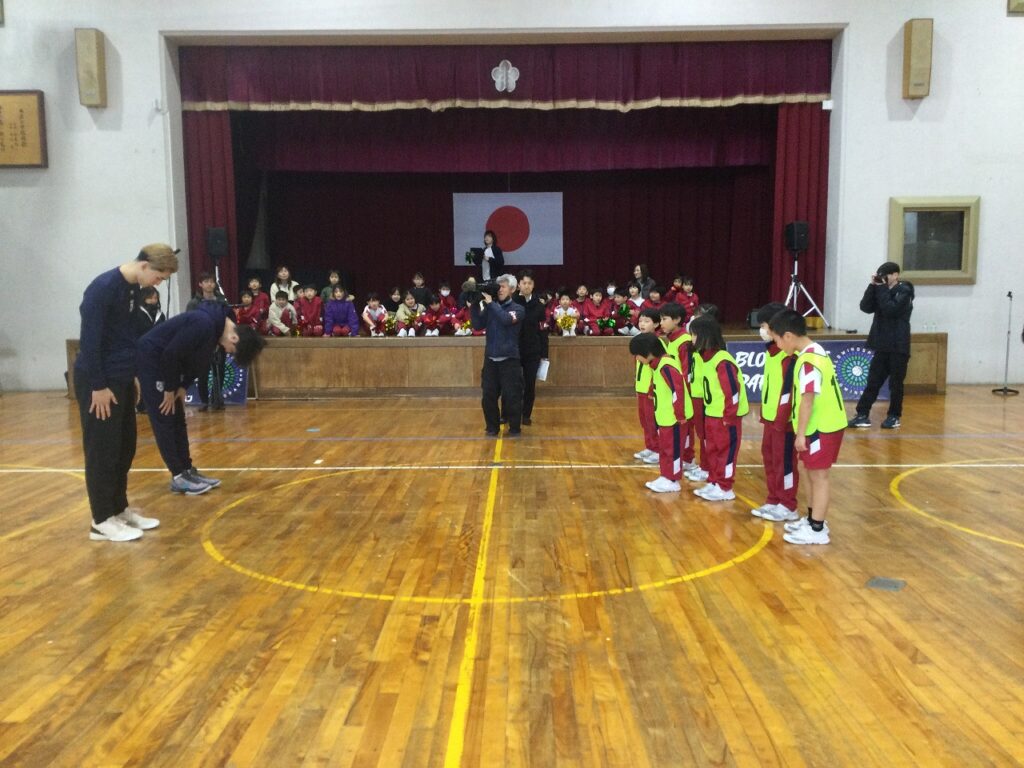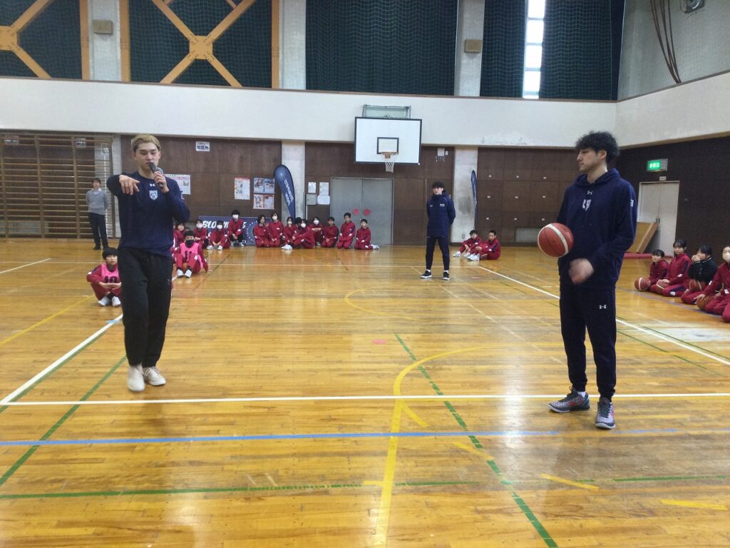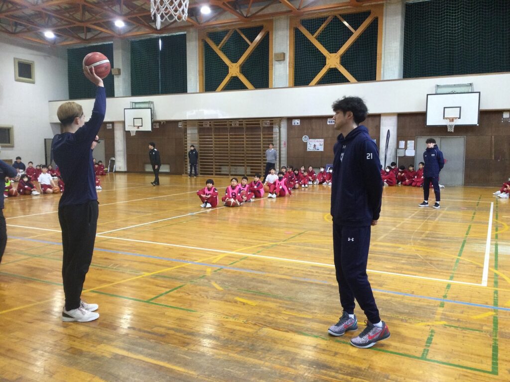 今回、本校の子どもたちにバスケットボールの魅力を伝えに来てくださった選手は、今シーズンのキャプテン満田丈太郎選手と川島聖那選手です。大きな拍手で両選手を迎えました。