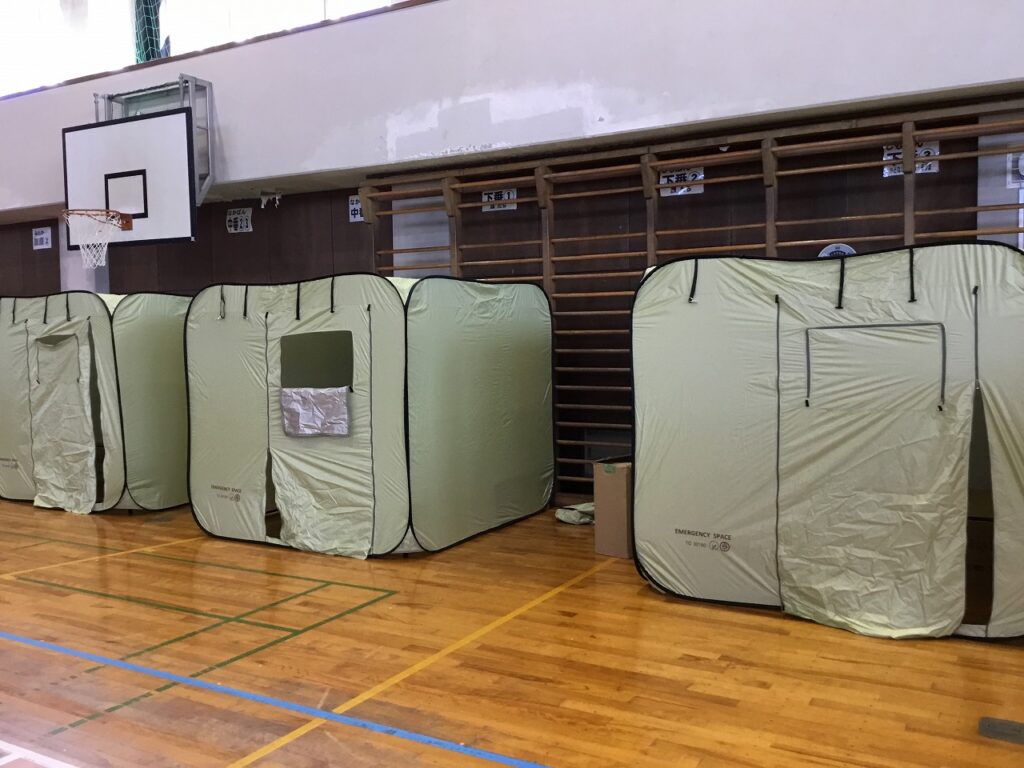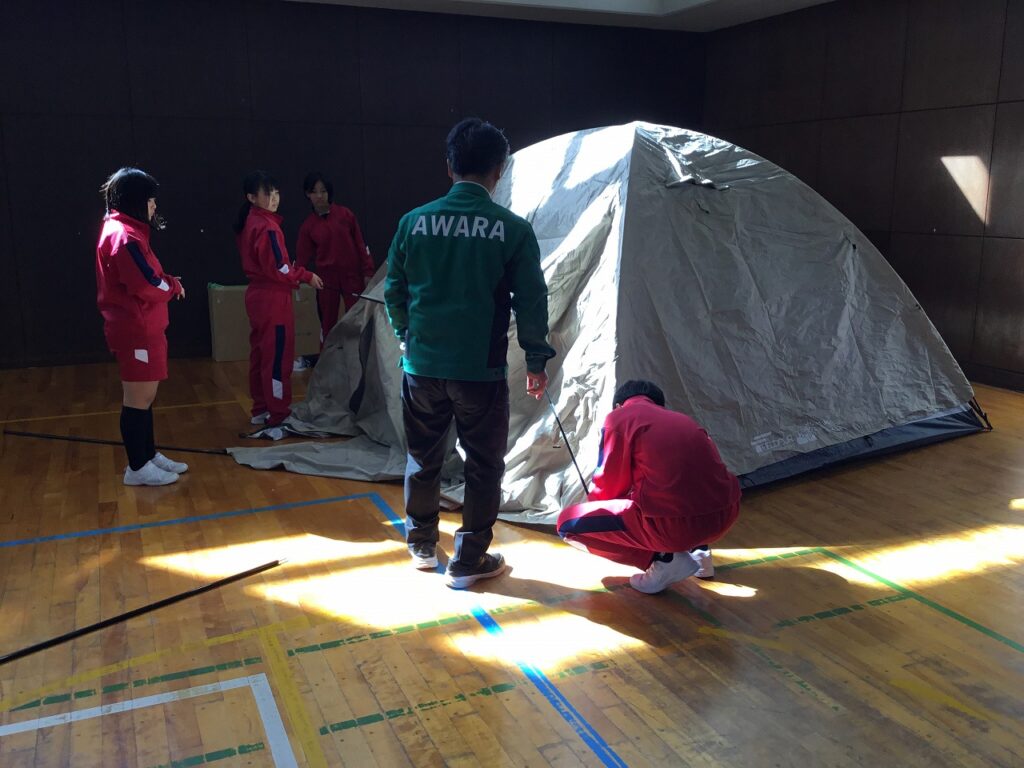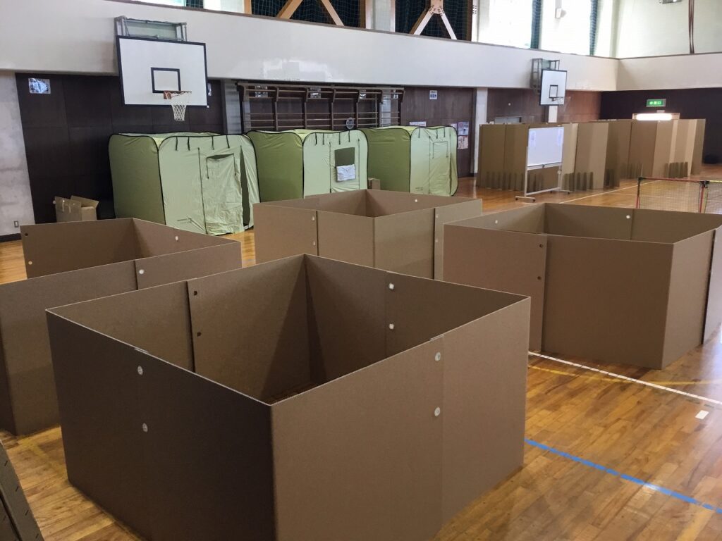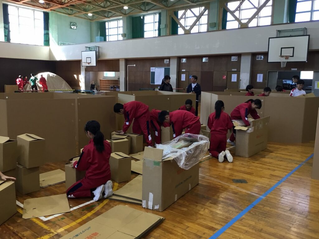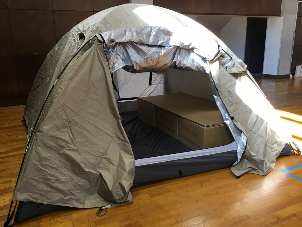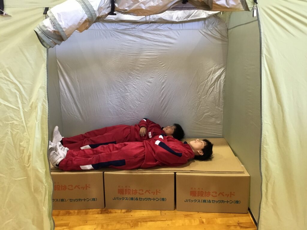 まずは、避難者を受け入れるための準備です。間仕切りや段ボールベッド、簡易トイレ、ドーム型テントなどを協力し合って組み立てました。