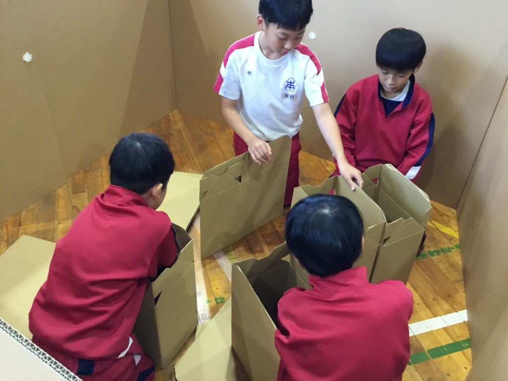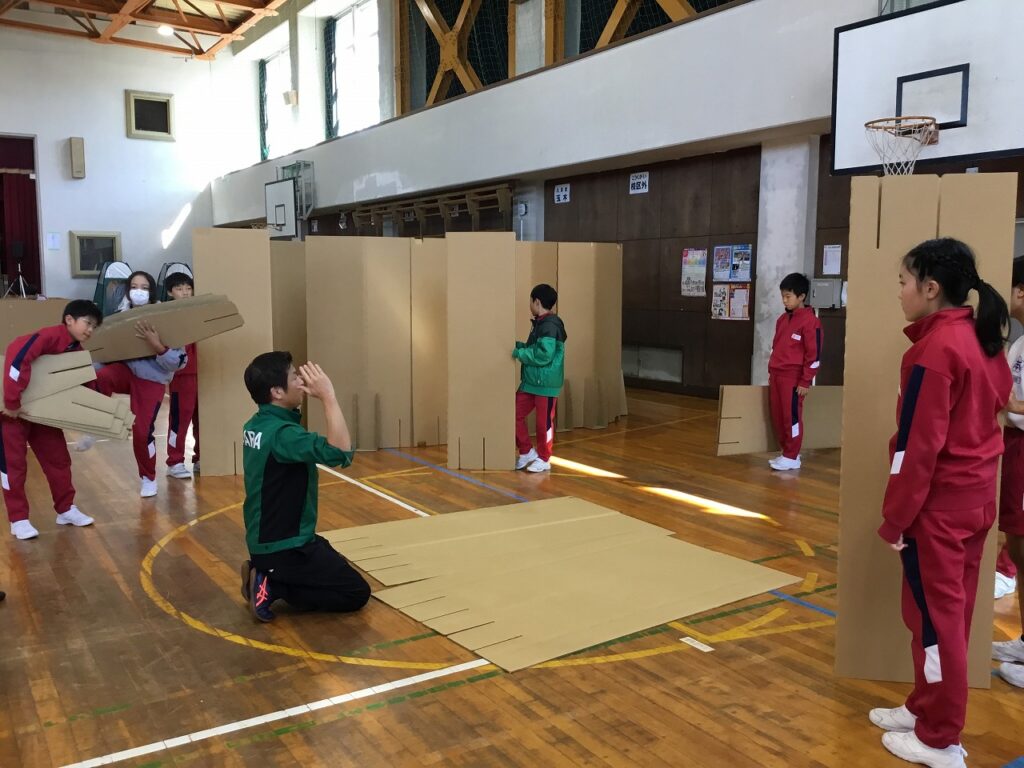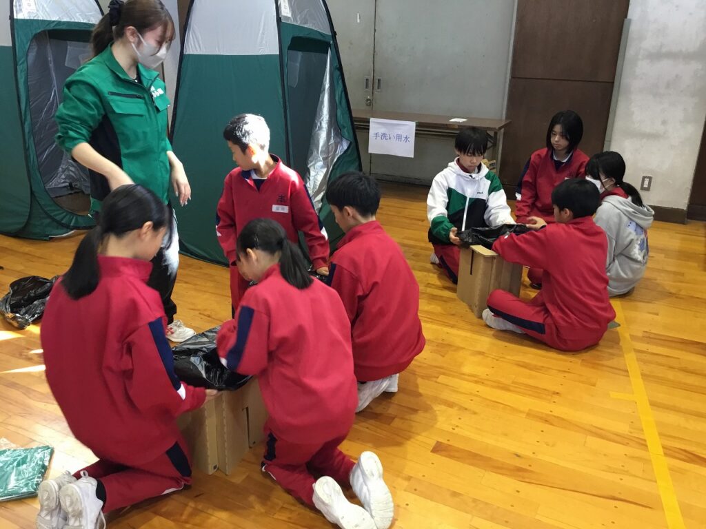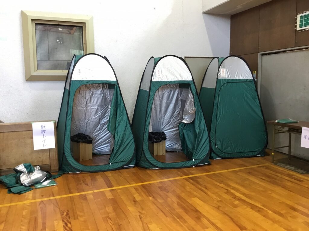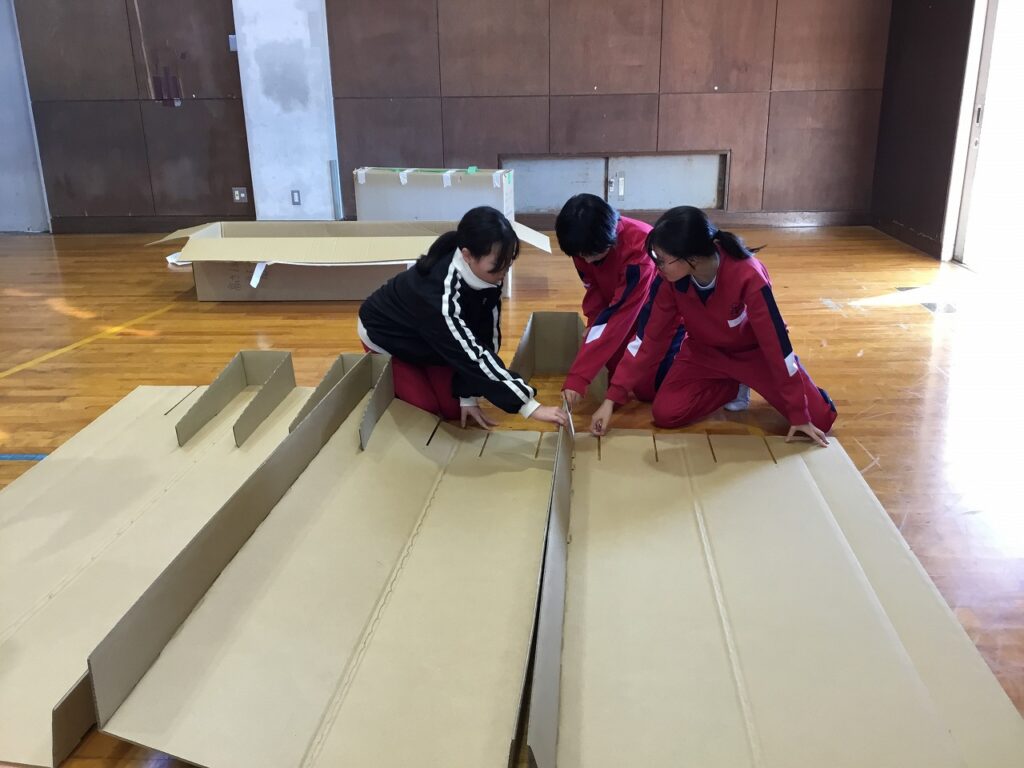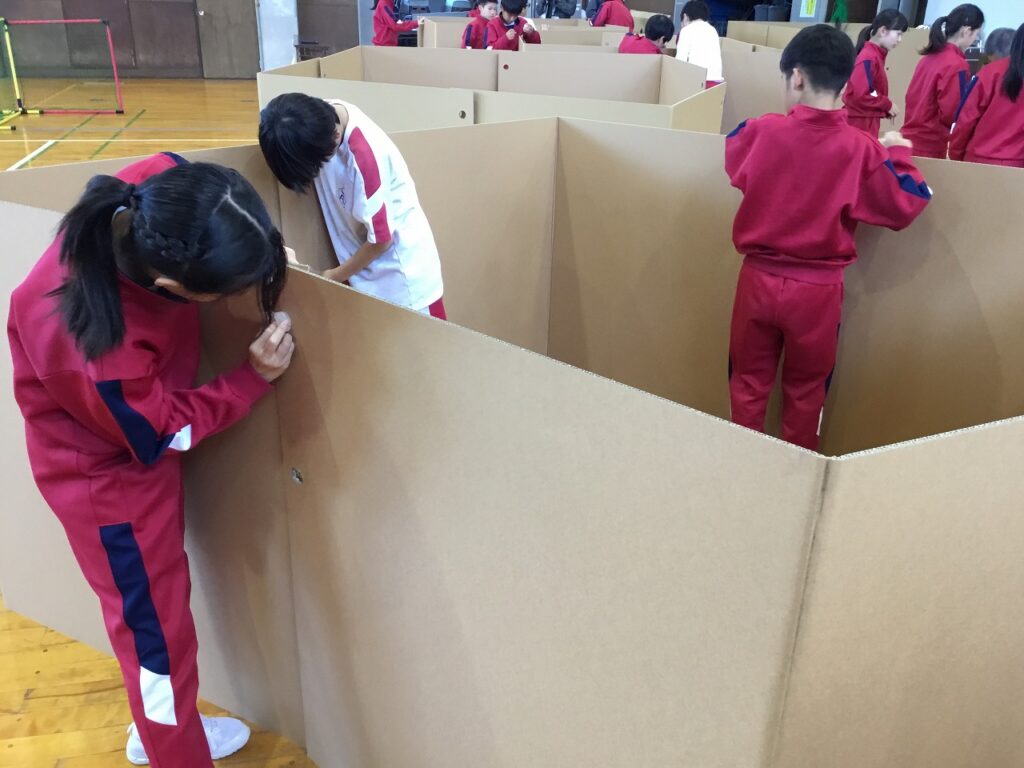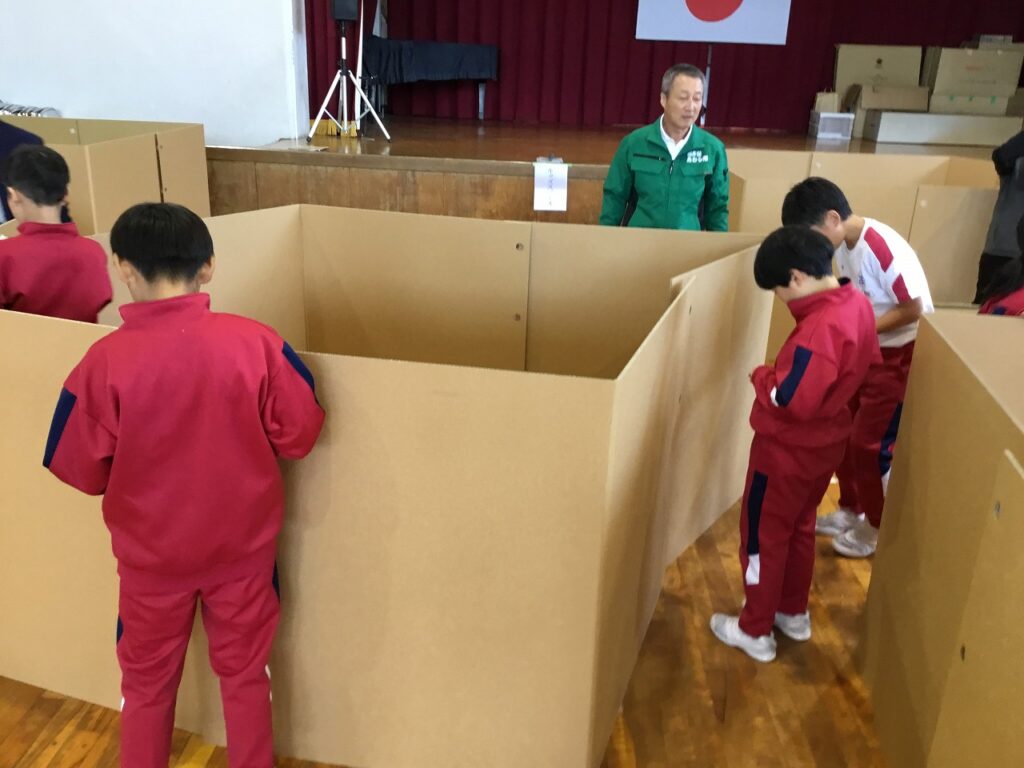 まずは、避難者を受け入れるための準備です。間仕切りや段ボールベッド、簡易トイレ、ドーム型テントなどを協力し合って組み立てました。
