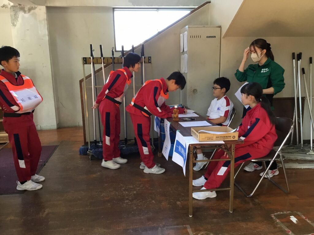 いよいよ避難所受け入れ側と避難者役に分かれて、実際どのように運営するかを体験しました。体験を通して子どもたちは、避難所が開設され、避難者を受け入れる流れを理解するとともに、その大変さを実感したようです。