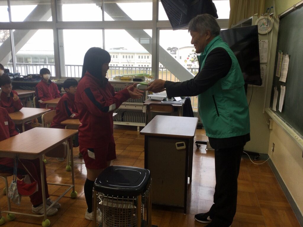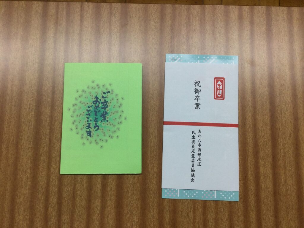 あわら市西部地区民生委員児童委員協議会から、卒業する6年生に温かいメッセージとお祝いの品をいただきました。代表の児童が受け取り、全員でお礼を伝えました。これまで温かく見守ってくださった民生委員児童委員の皆様に、心から感謝申し上げます。