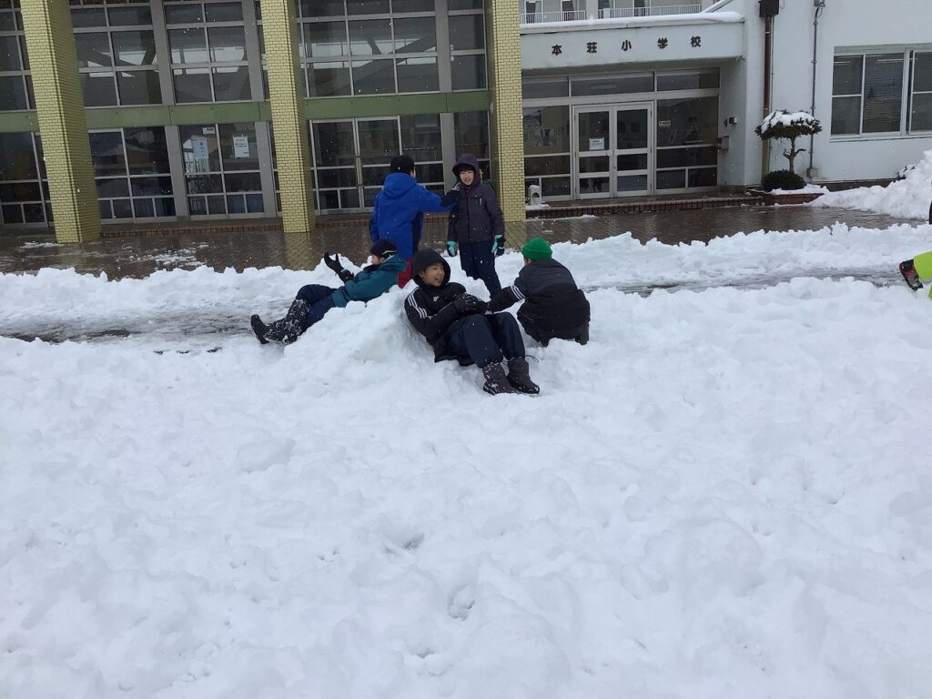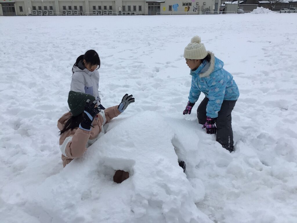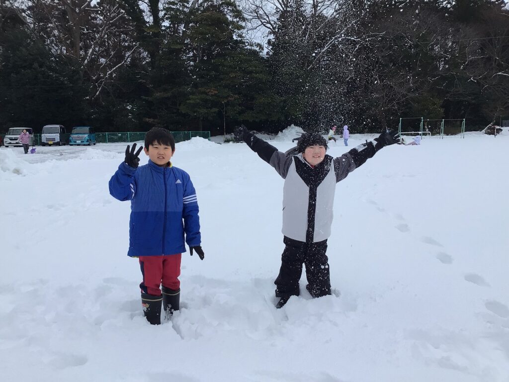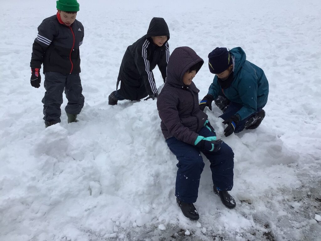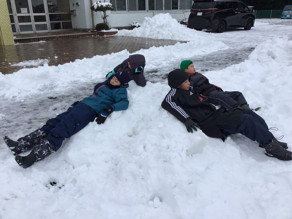 今日は3年生と5年生が雪遊びを楽しみました。雪投げをしたり、雪で何かを造ったり、雪の上に寝転んだりと、みんなとても楽しそうでした。