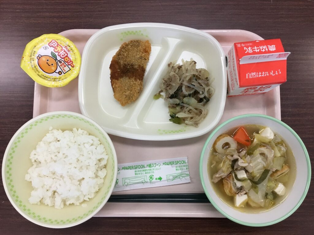 今週は給食週間です。今年のテーマは「おいしく減塩! 健康給食週間」です。塩分を減らし、出汁のきいた白菜鍋と、昨日の天神講にちなんだカレイのフライがメニューでした。
