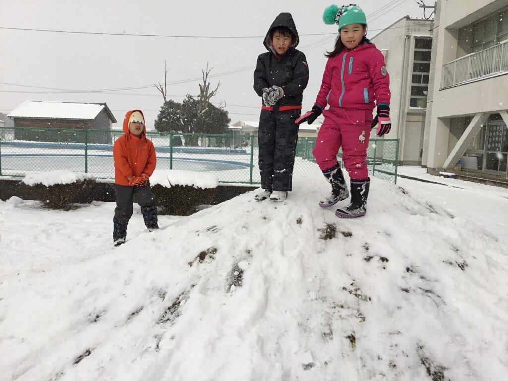1月22日(木)、昨夜から降った雪ですっかり雪景色となりました。1年生が早速、雪遊びを楽しみました。子どもたちは大はしゃぎです。